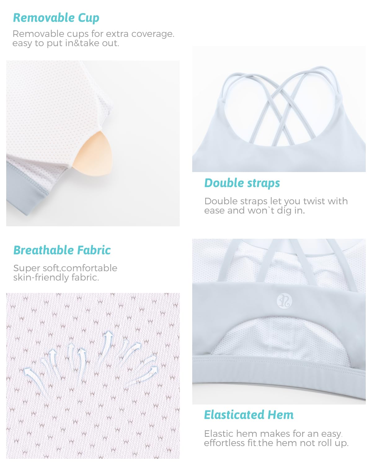 √YOUR SECURE FIT - Strappy design meets sporty style. Super soft scoop neckline with light, removable pads. Open cutout back styling sports bras for women medium support, widen band underneath the breast ensures a tight secure fit. Removable cups for extra coverage. The removable vertical cotton bra pads are easy to clean.The padded sports bra which always retains its shape and prevent bra bulges, caresses your figure to adjust to your curves.