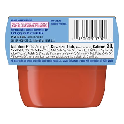 Gerber Stage 1 Baby Food, Carrot Puree Tubs are a premium choice for your child’s early stages. Crafted to help support their nutritional needs, along with meeting the busy lifestyle needs of caretakers and parents. Each baby puree tub is made in a portable, easy-to-store format – making it perfect for life’s busy moments. This stage 1 baby food puree is designed for babies who are able to sit with help or support and are ready to start solids. Gerber understands the importance of providing wholesome ingredients during the crucial developmental stages of your child's life -- that’s why these tubs are Non-GMO Project Verified. This vegetable baby food puree has no added salt, and no artificial flavors or colors. They need to be refrigerated after opening and must be used after 1 day. Gerber baby puree is ideal for parents who seek a convenient and high-quality option in their baby's diet.