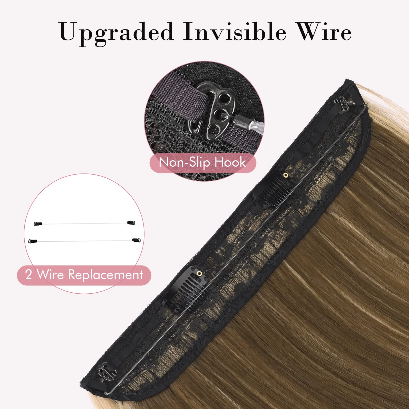Adjustable Size to Get Perfect Fit: 1.Put the plastic hook into 5 different notches. 2. Total 2PCS wire in different length 8/9inch(1PC attached on hair and 1PC wire replacement)