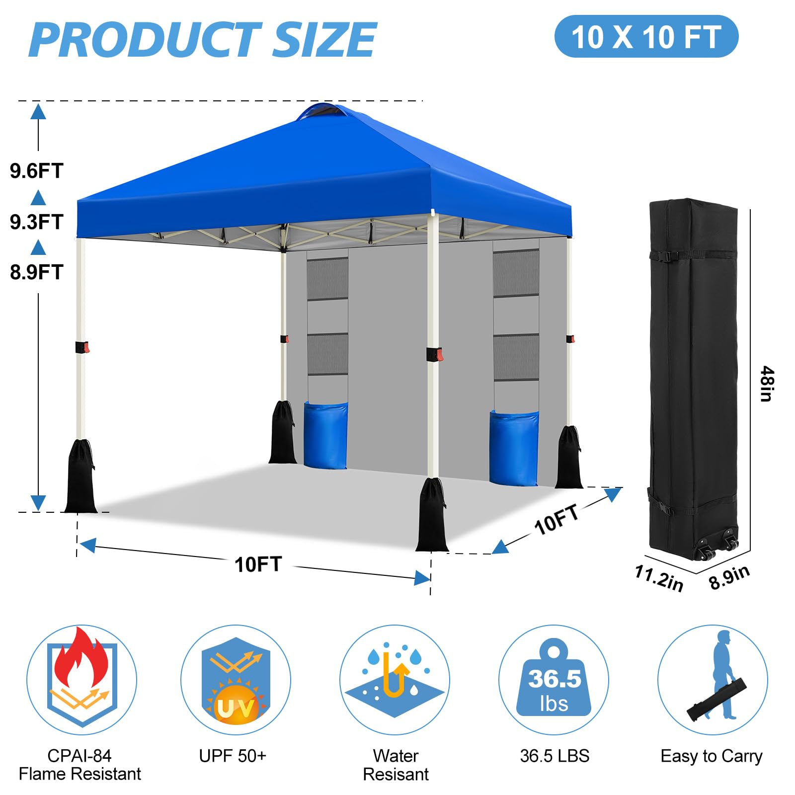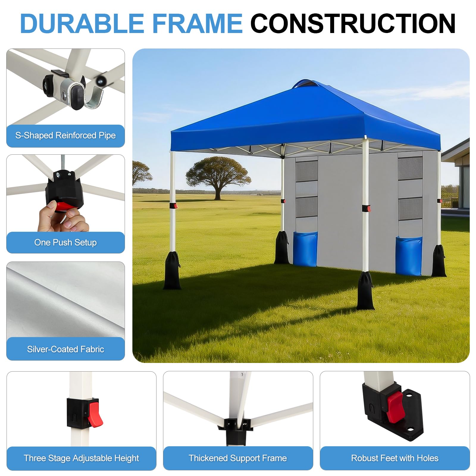 Ventilation and UV Protection: The easy up canopy is height-adjustable via smooth slides on all four sides and red locking clips, with a choice of three heights (8.9 feet, 9.3 feet, 9.6 feet) to customize the comfort experience. Thickened steel pipe design reinforced with pre installed heavy-duty bolts to ensure stability during adjustment and firmly fix the structure