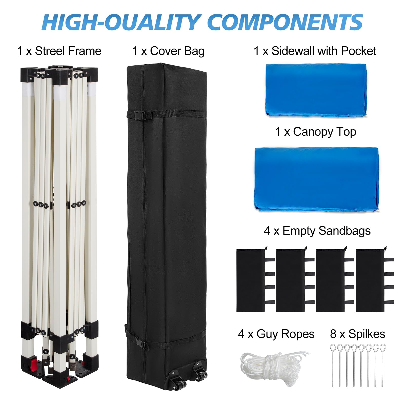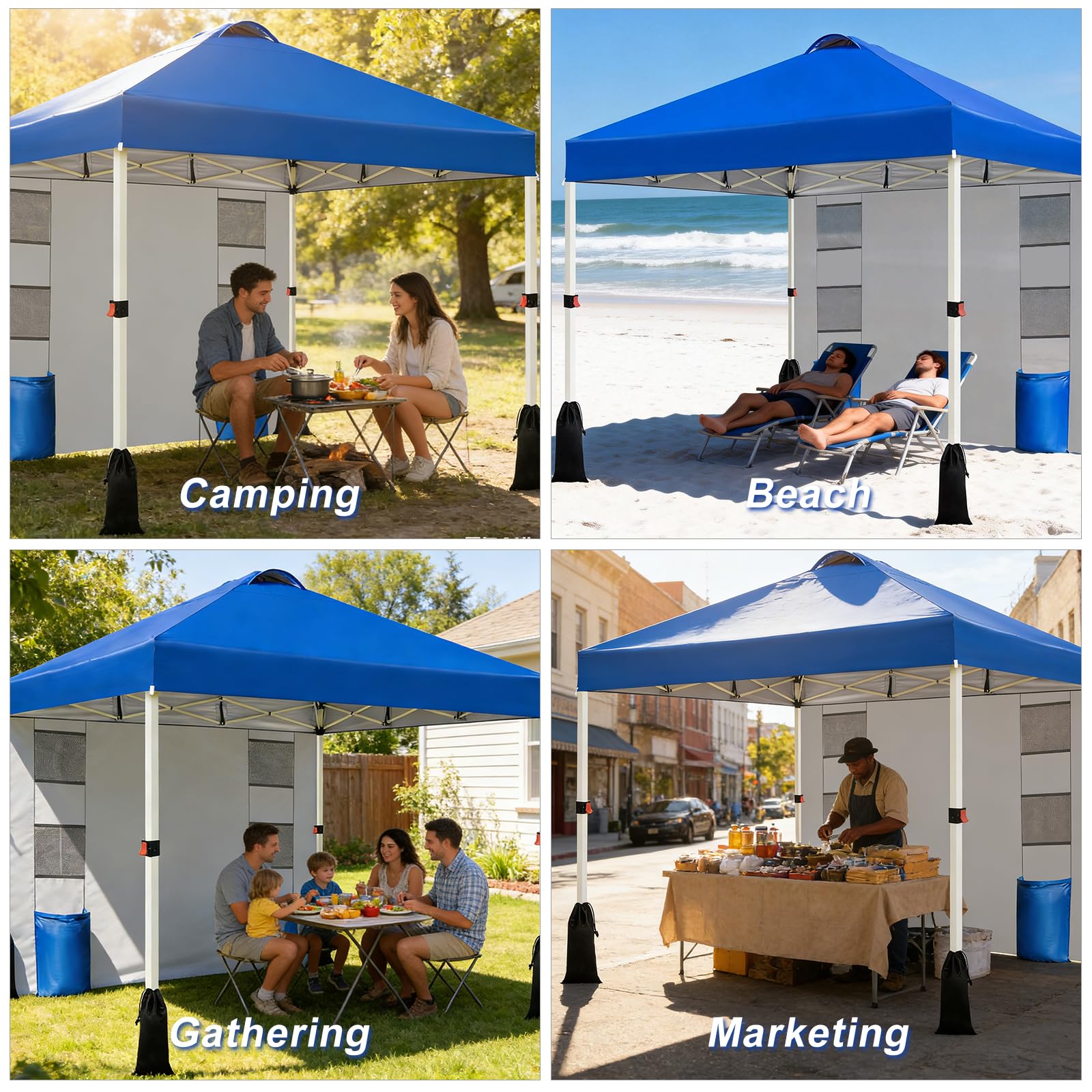 Portability and Practical Accessories: The pop-up instant canopy is equipped with a portable roller bag that is lightweight and durable, optimized in size for easy carrying and storage. Whether on the beach, camping or market, the portable design allows for flexible usage scenarios