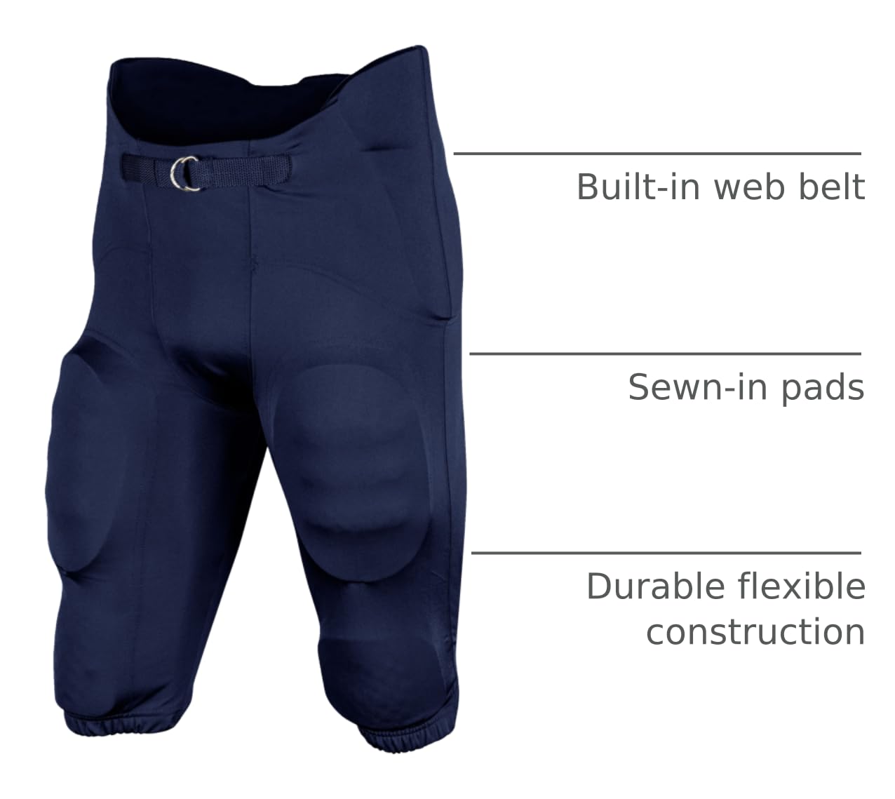 Description CHAMPRO Terminator 2 Football Pants are a great choice for games and practices for athletes of all ages and skill levels. Theyβre made of 100% Polyester Stretch Matte Dazzle fabric for durable, flexible construction. Hassle-free, factory-installed pads come already sewn in to reduce prep time so athletes can get ready for games and practice quickly. A built-in, full-length covered web belt takes the fuss out of securing the pants. The pantsβ fitted cut is designed to follow the contour of the body while allowing for ease of movement. Available in Adult sizes S-3XL and Youth sizes XXS-2XL and Husky in 13 colors.