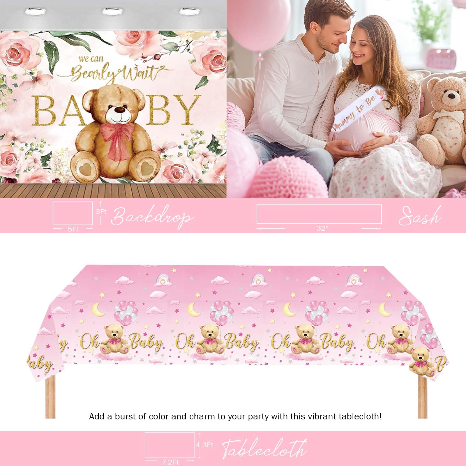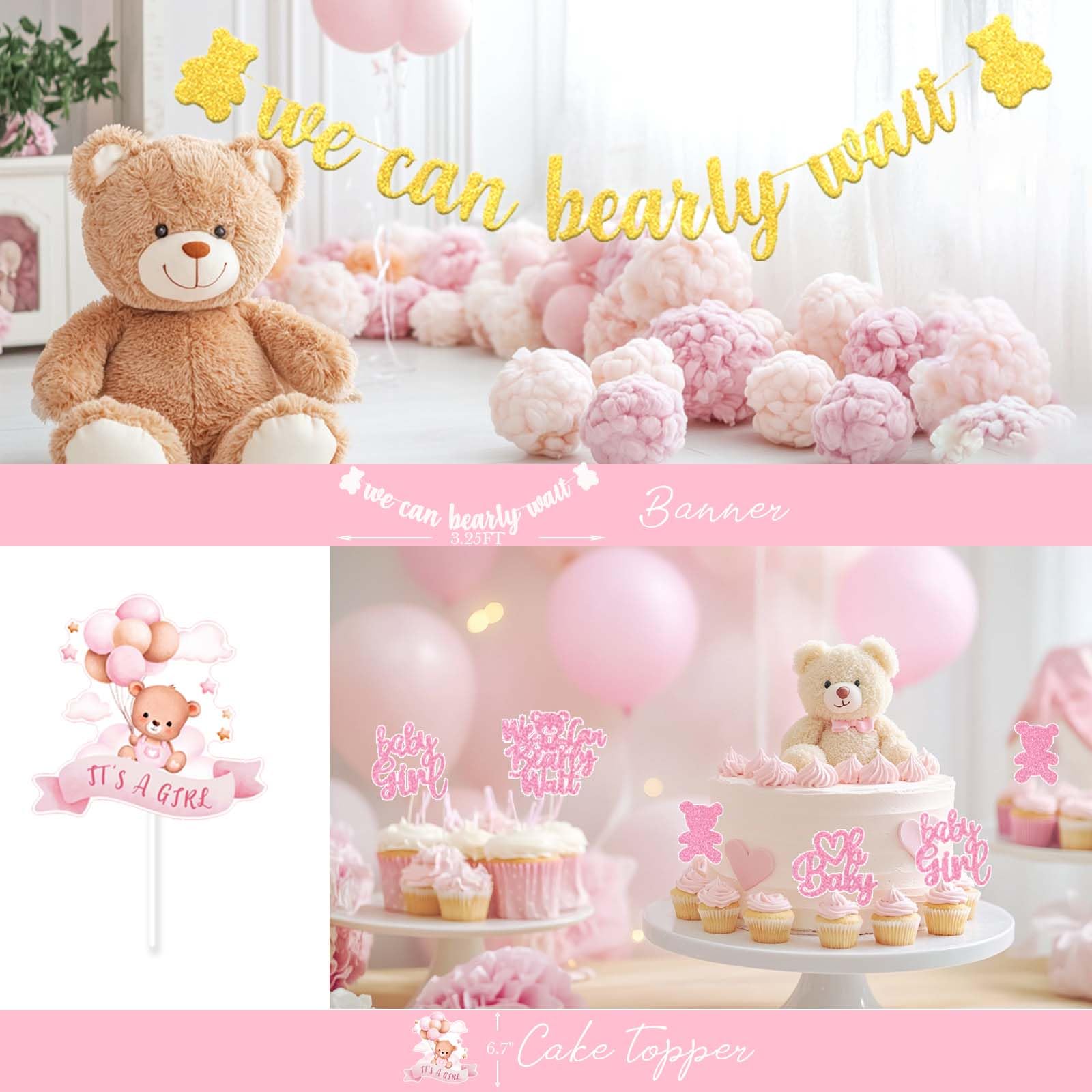 We Can Bearly Wait Baby Shower Decorations: Step into a world where teddy bear baby shower decorations create a wonderland for your girl. Soft pink hues fill the room, while teddy bears add a warm touch to this magical moment. The air is filled with excitement as we can bearly wait to welcome her, wrapping the space in a loving embrace as you celebrate the arrival of your precious little girl