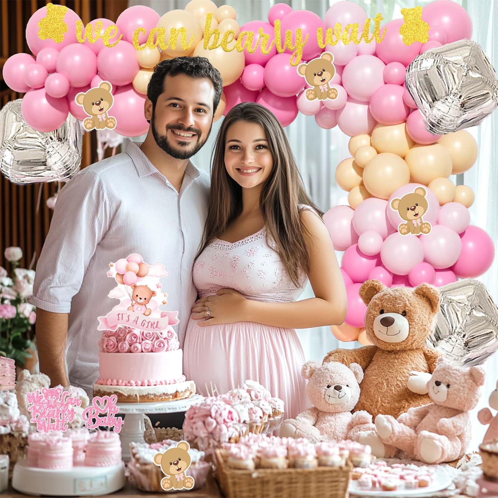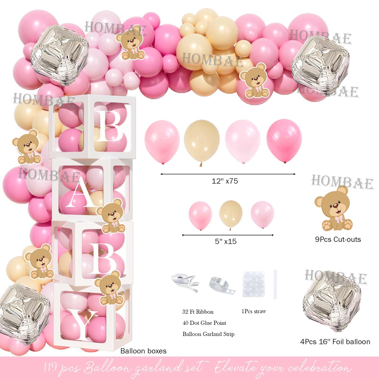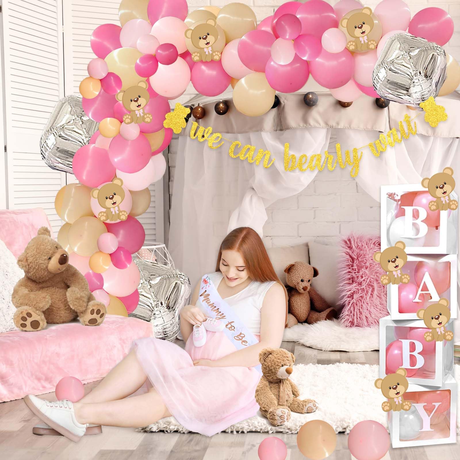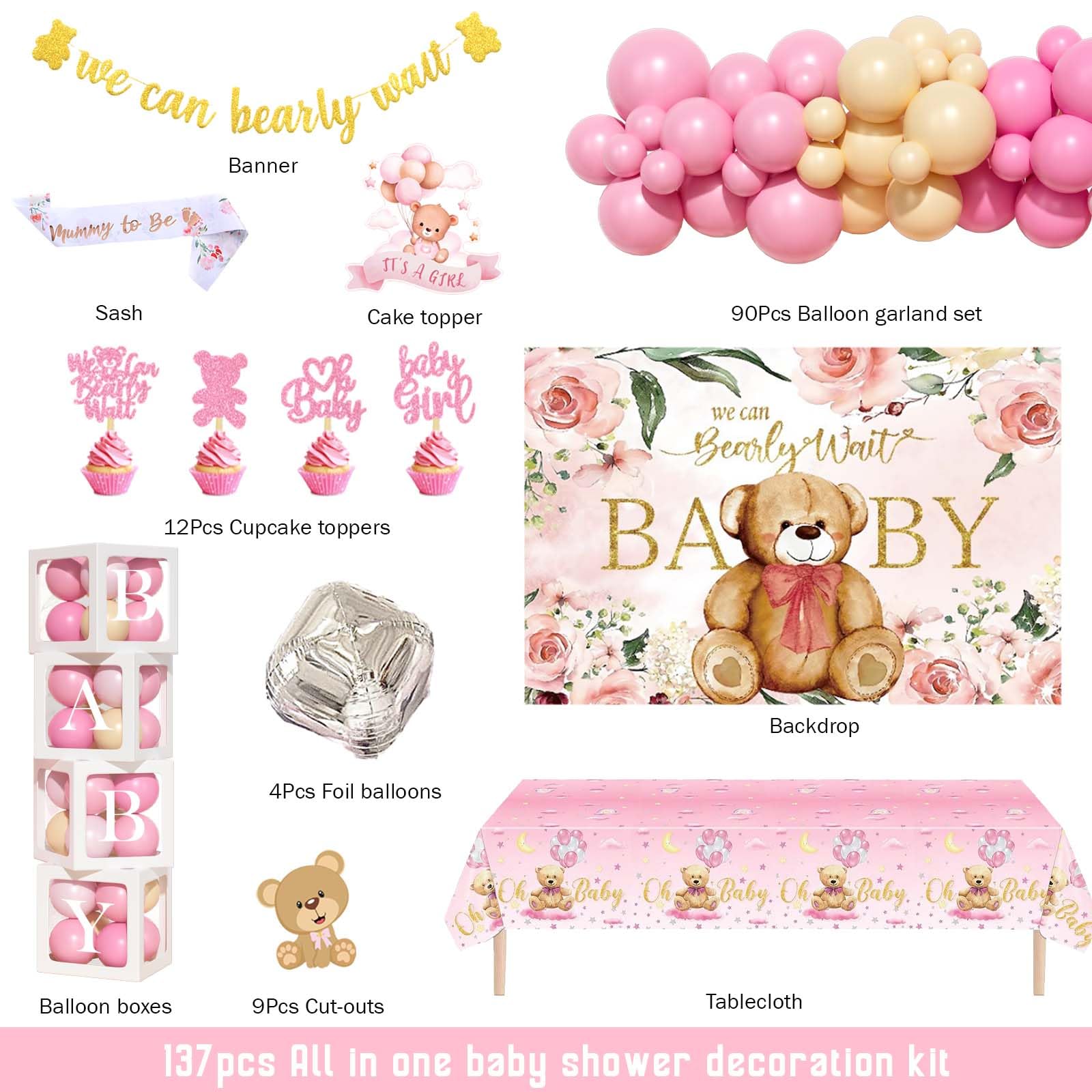 Teddy Bear Baby Shower Decorations for Girl: This kit includes 90 pcs pink and apricot balloon garland set, 4 pcs silver foil balloons, we can bearly wait backdrop, we can bearly wait glitter banner, 4 pcs white balloon boxes with letter cutouts, 9 pcs brown bear cutouts, pink Oh Baby tablecloth, IT’S A GIRL cake topper, 12 pcs pink bear glitter cupcake toppers, mom to be sash
