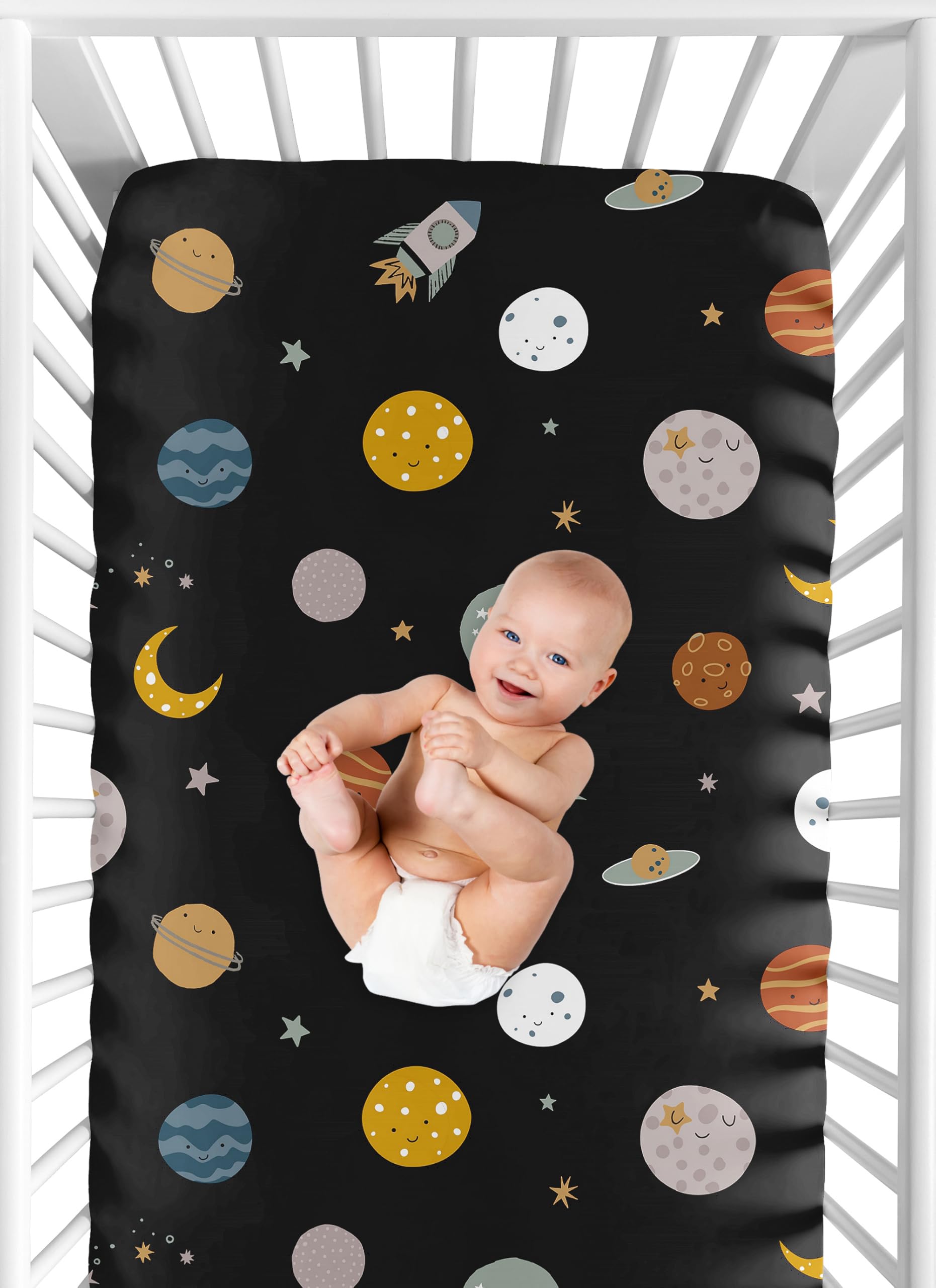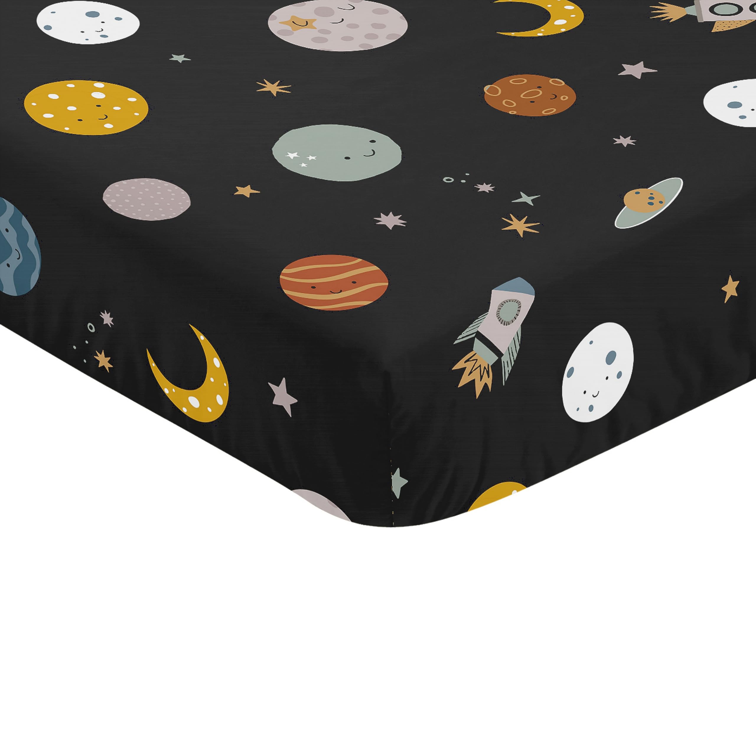DESIGNED IN THE USA: By real parents who understand the need for comfort, practicality, and style. Sweet Jojo Designs is a small, women owned business. The mom's on our team know a crib mattress sheet is first priority for your baby essentials to ensure a restful night of sleep. We use top fabrics and designs to create soft crib sheets that are stretchy and comfortable for your infant or toddler. We've studied the latest trends in space crib sheets for baby boy to bring you the finest product.