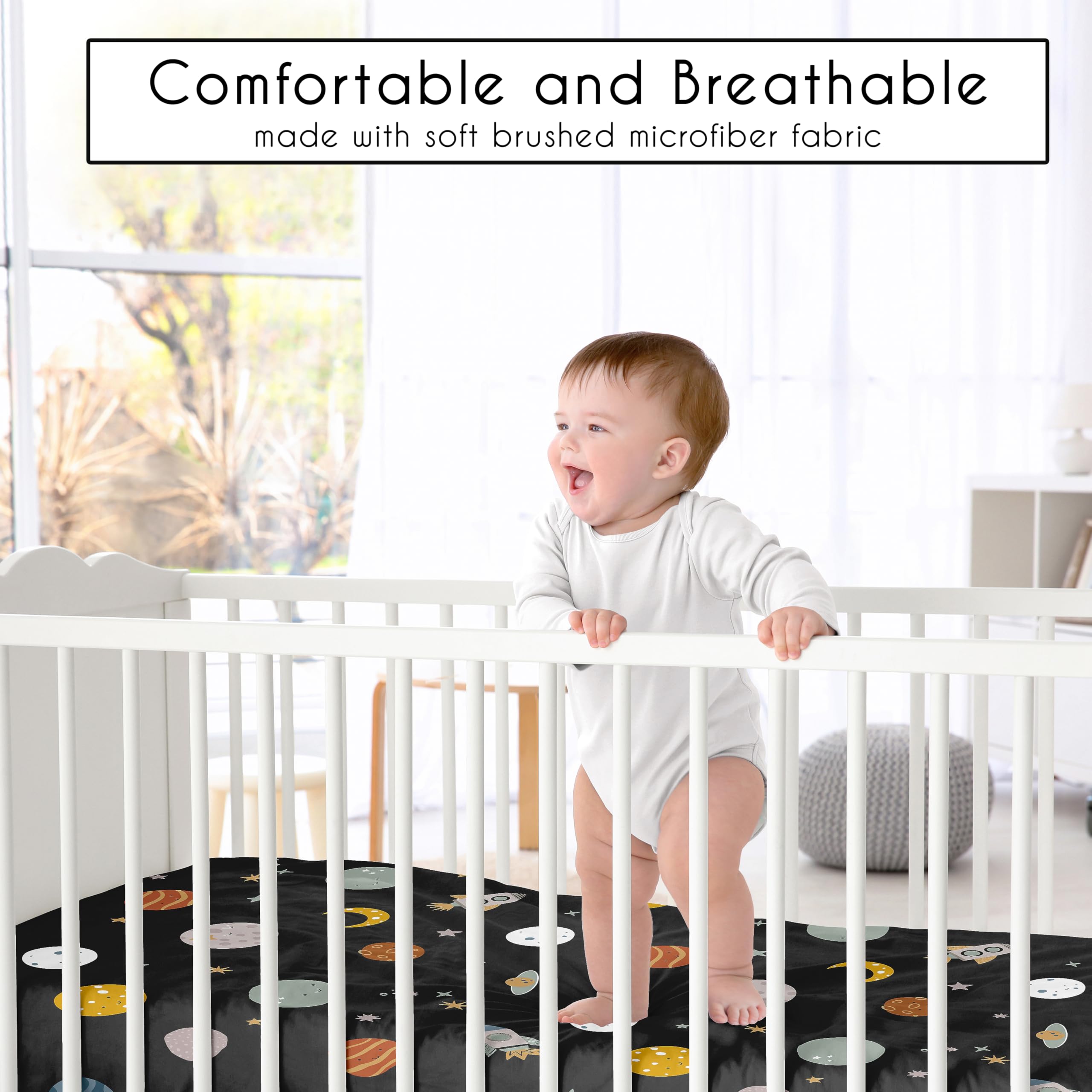 SNUG FIT: Includes (1) Fitted Crib Sheet 52in. x 28in. x 8in. Our newborn standard crib sheets fit snugly, with premium elastic sewn around the entire bottom edge for a secure fit on most standard sized cribs and toddler beds, to reduce shifting and bunching. This whimsical, outerspace brushed microfiber crib sheet features an exclusive design of black, red & yellow galaxy, outer space planets, rocket ship, moon & stars print & is gentle on delicate skin to foster a soothing sleep environment.
