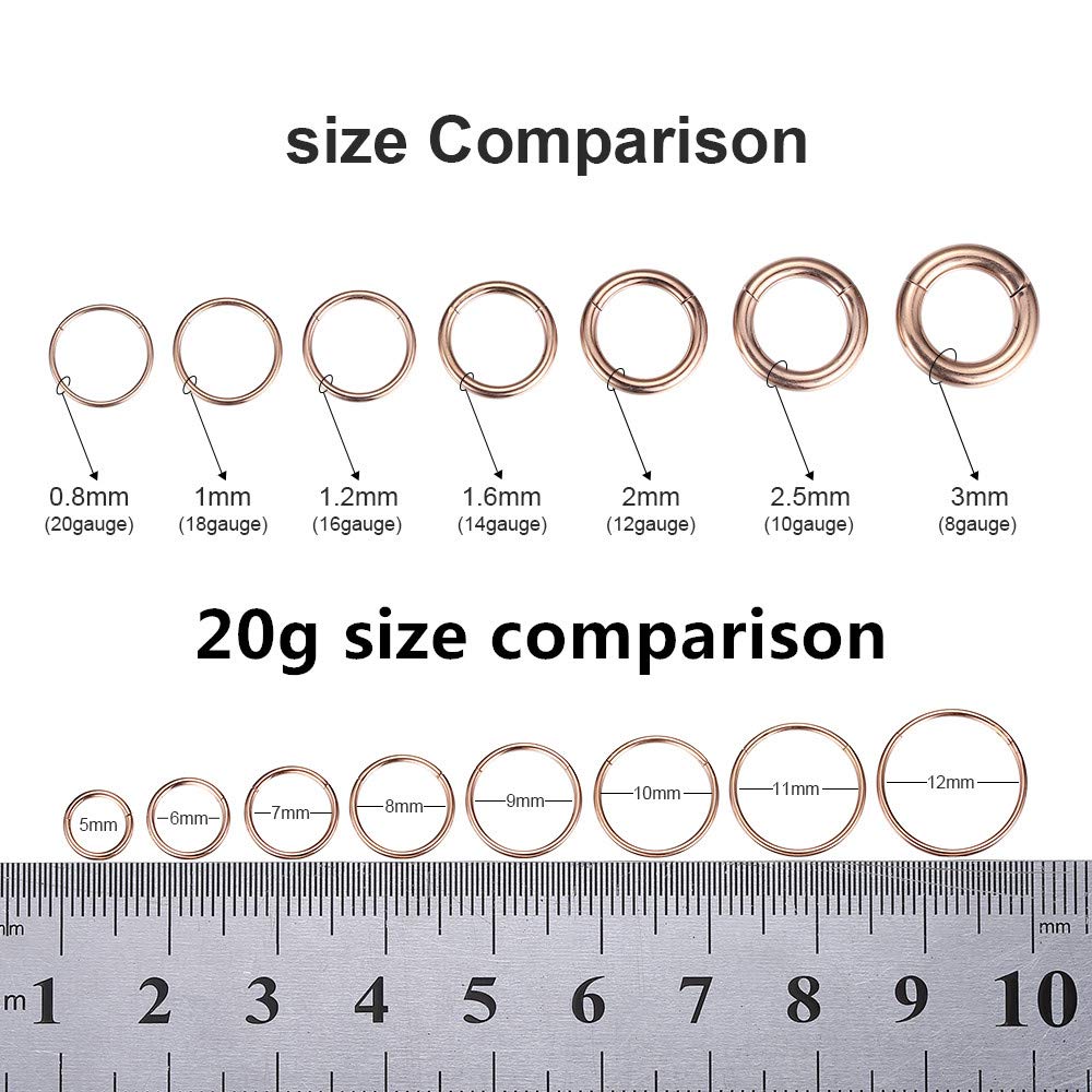 Sold individually Nose Hoop Ring/Earring Hoop Size: 20 gauge (thickness: 0.8mm), inner diameter 9/32 inches(7mm ),Please choose your gauge and diameter hoop for your nose piercing needs.It has a smooth closure that doesn't slipped or opened. It's still tight after long-term use.