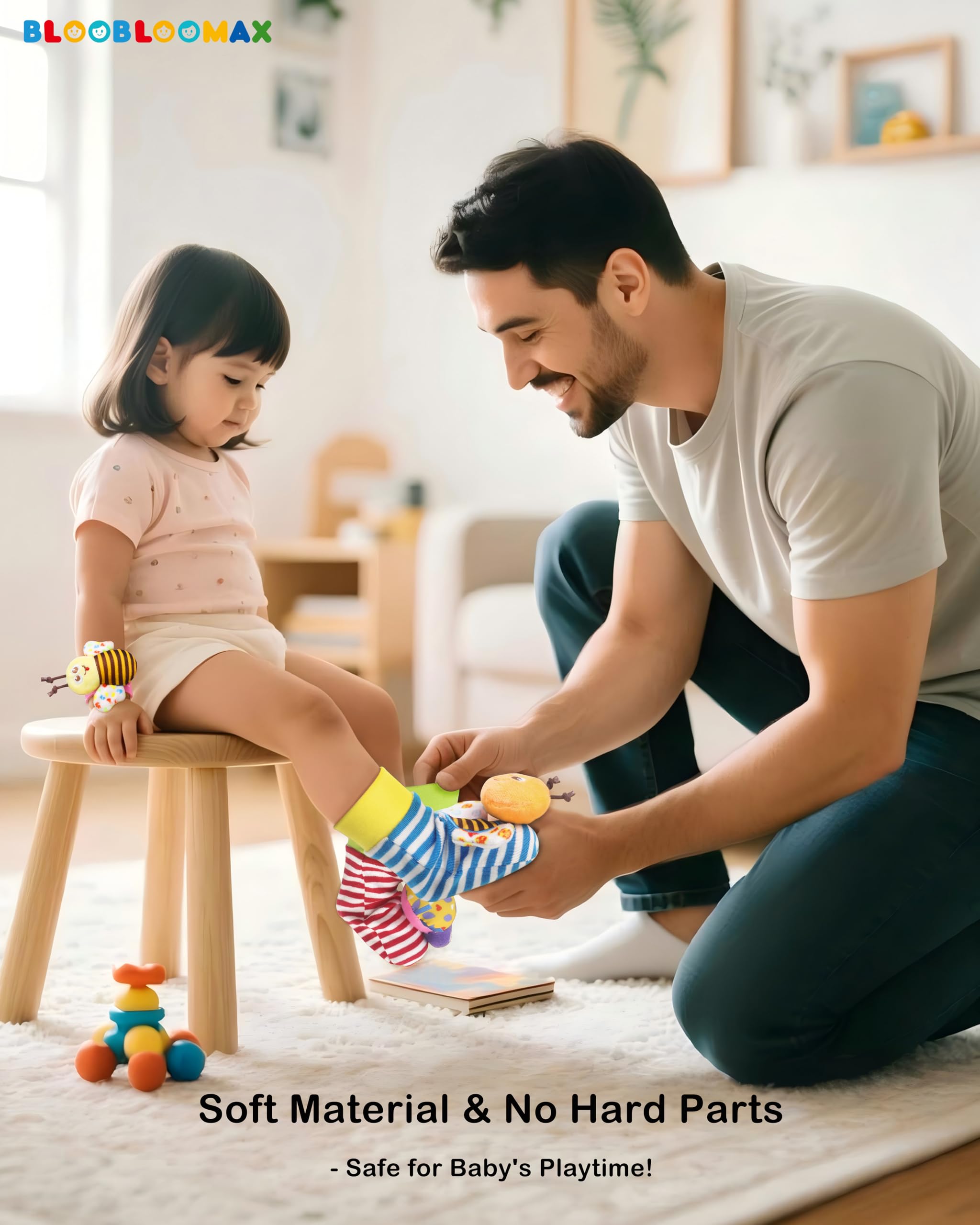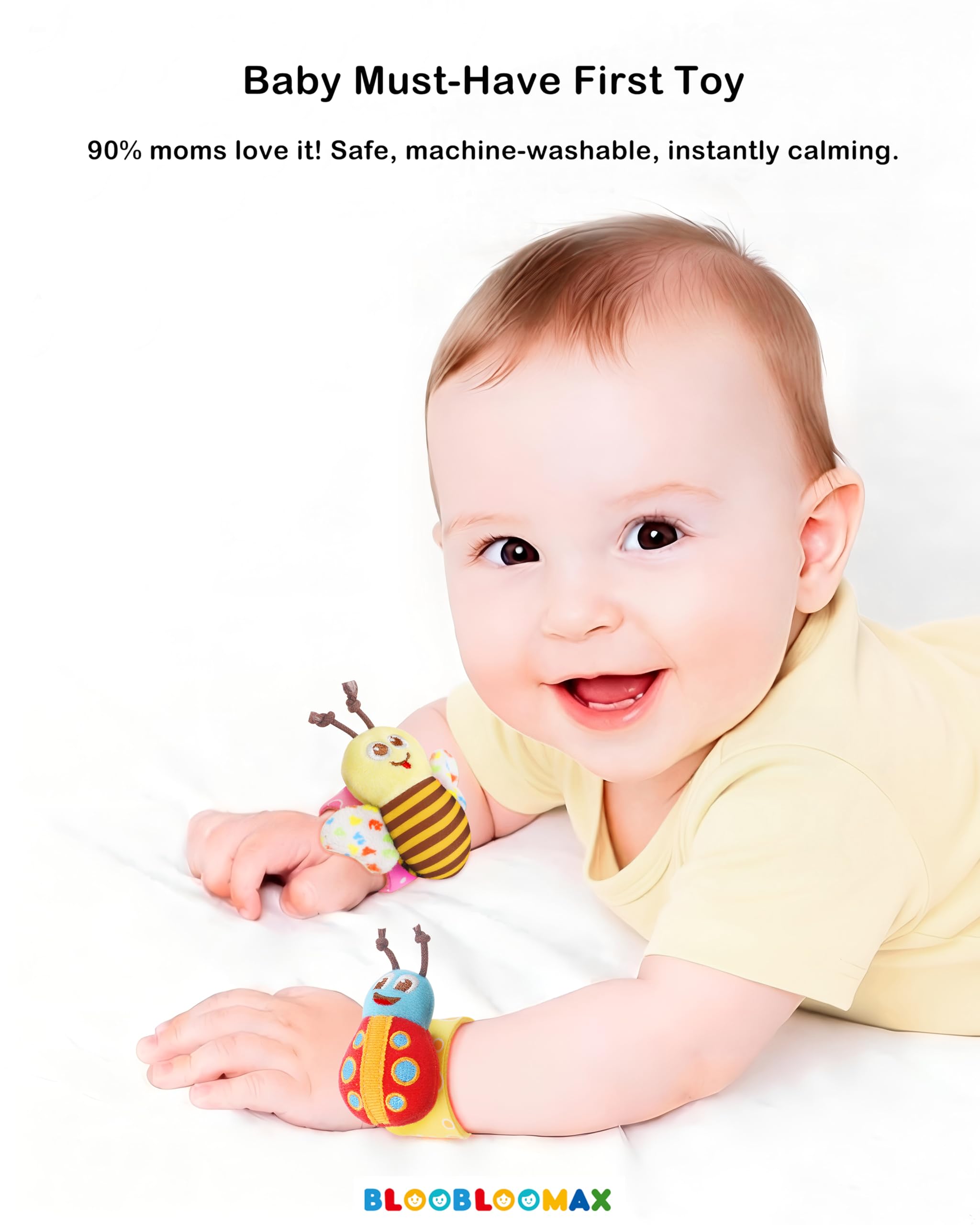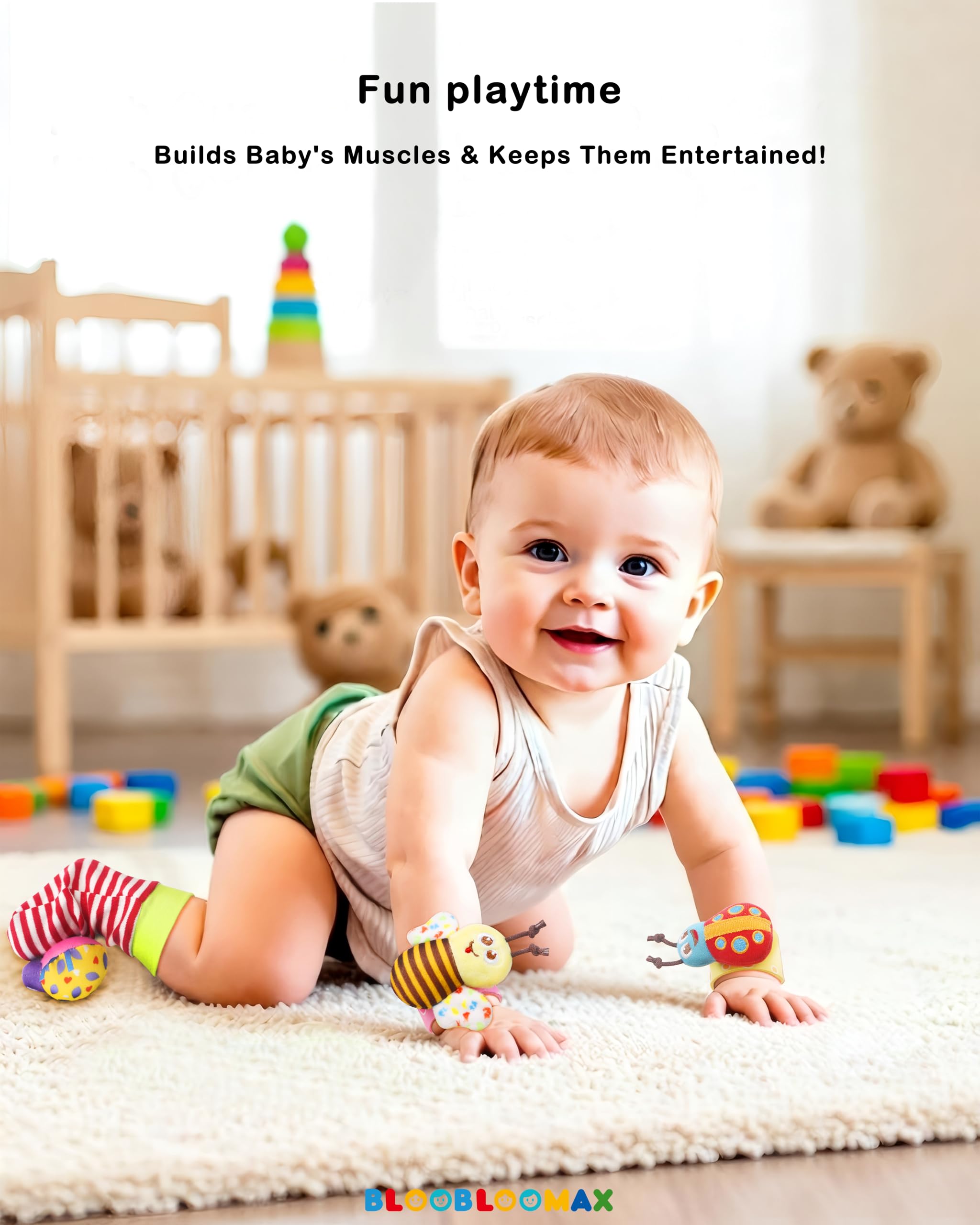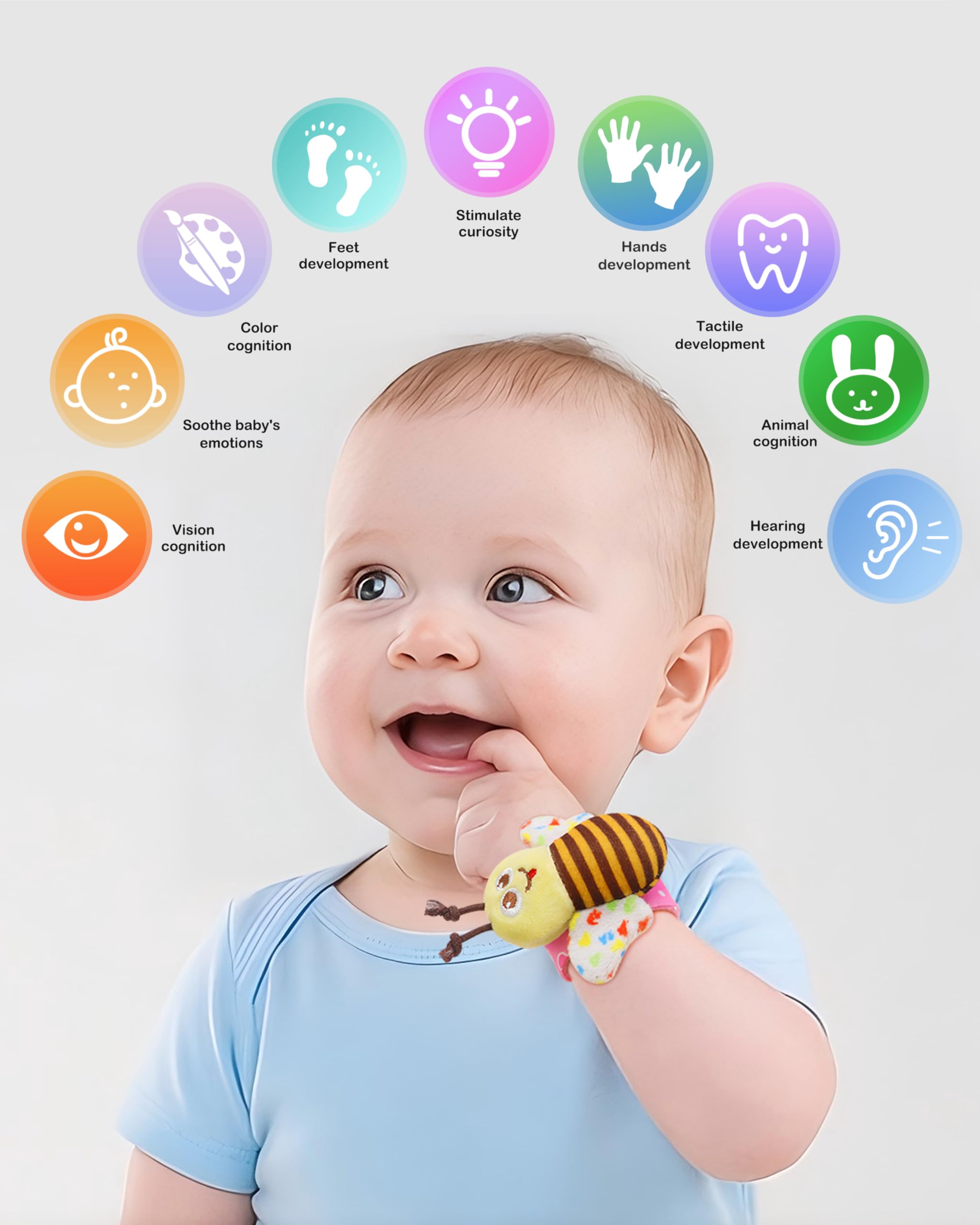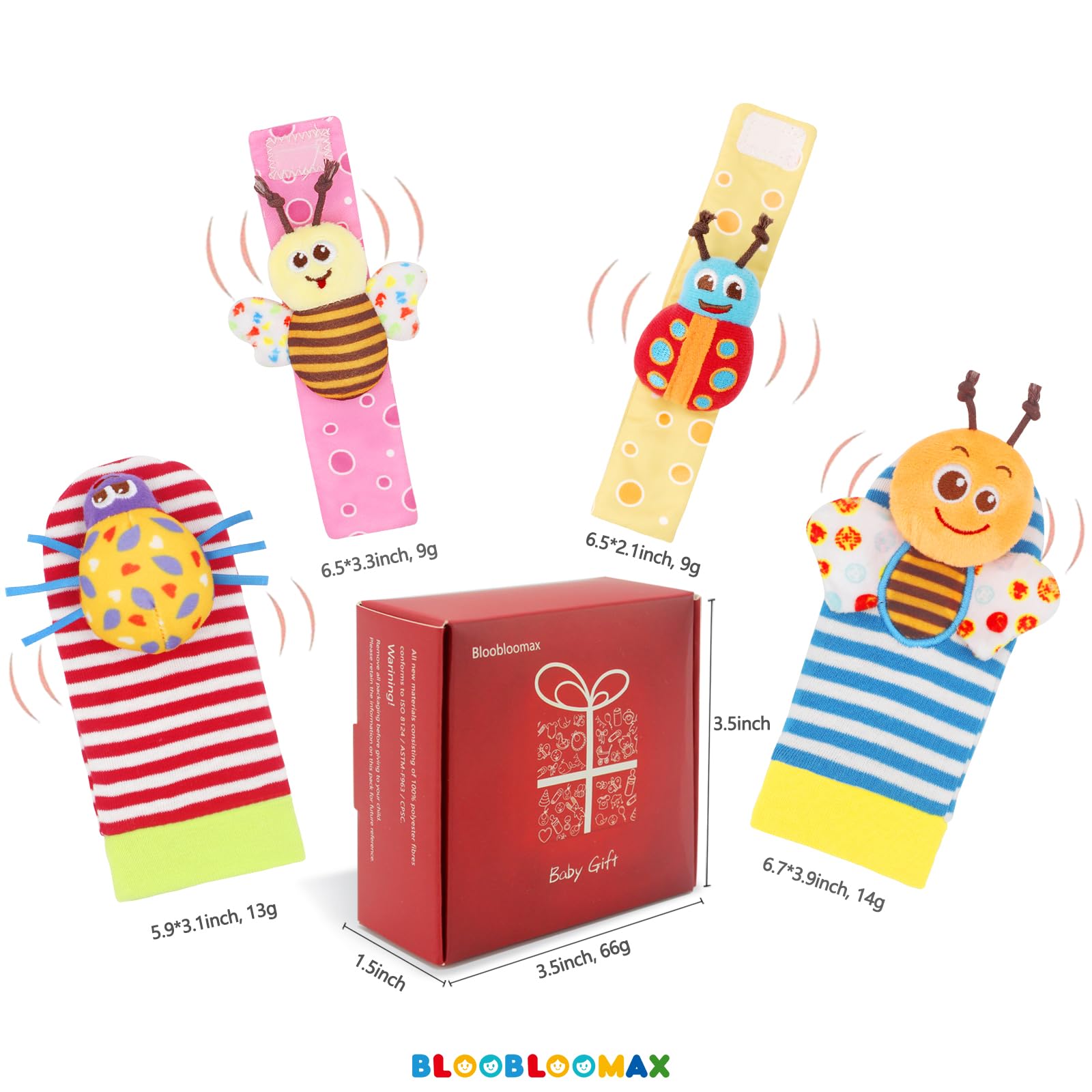 CUTE DESIGN -- All Wrist Rattles and Foot finder socks have bells inside, the Wrists rattles attach with fabric hook, easy to put on and take off. The wings of Bee and Butterfly were with sound paper, encourage baby to reach and grab.
