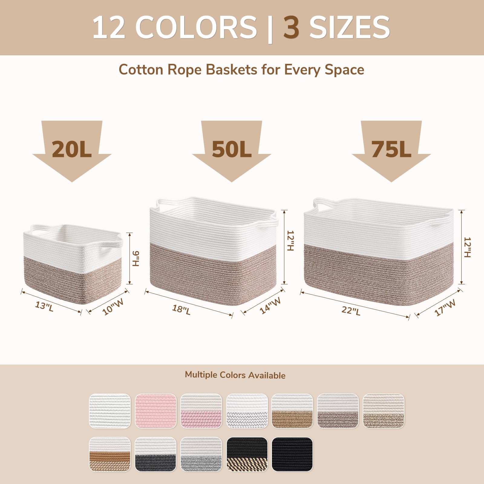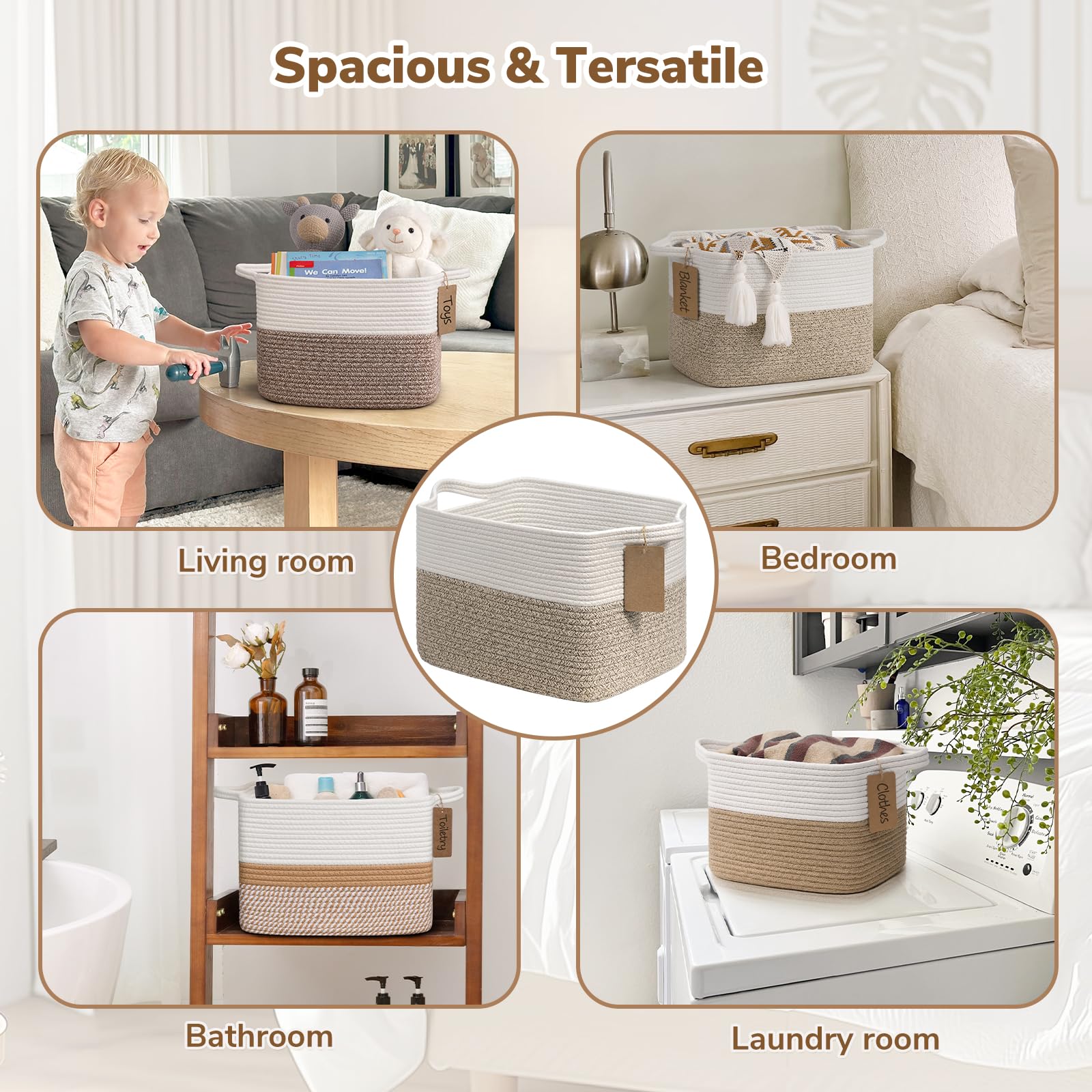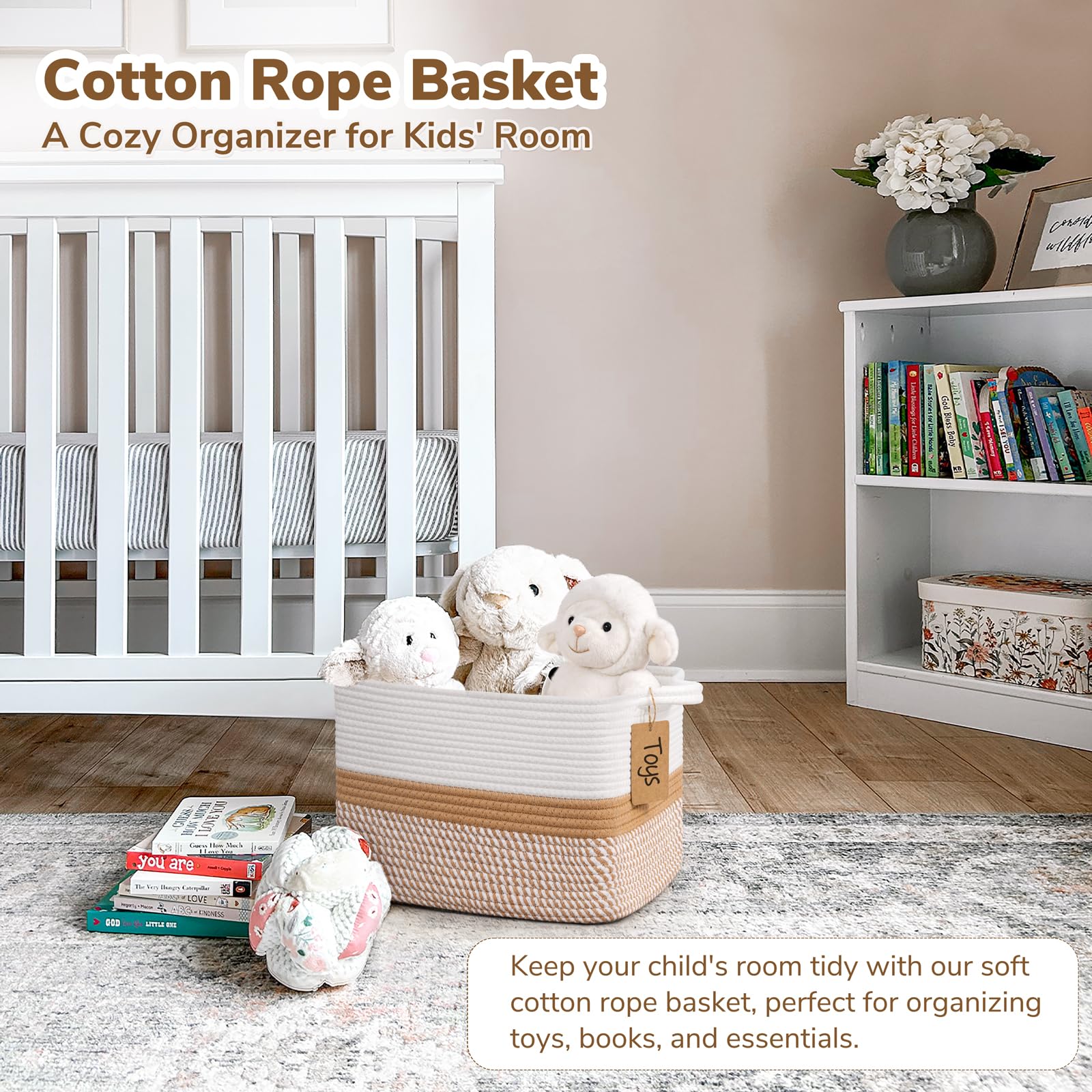 Soft Material. The decorative basket is made of cotton rope with a soft touch, which is perfect for home use, especially for toddlers, babies, children, and pets. It's a smart choice for organizing clothes, toys, stuffed animals, blankets, and even throwing pillows