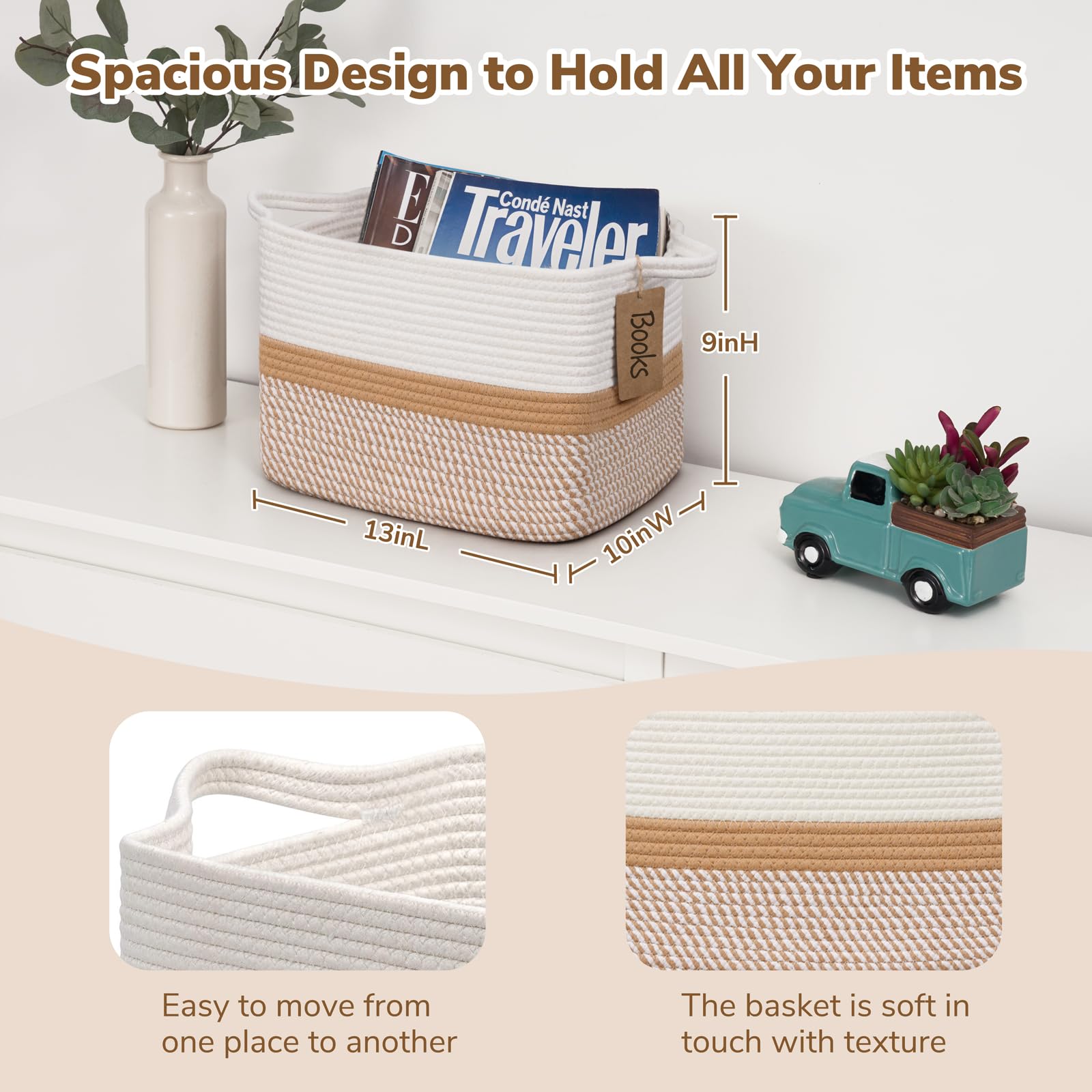 Stylish Gift Basket for Living Room Home Decor - Material: Cotton - Size: 13 x 10 x 9 inches - Multiple Use: You can have the storage basket in nursery, living room, bedroom, bathroom or laundry room to hold your books, towels, toys storage etc. - Machine Wash: You can put the basket in a laundry bag to wash it by machine or hand wash.