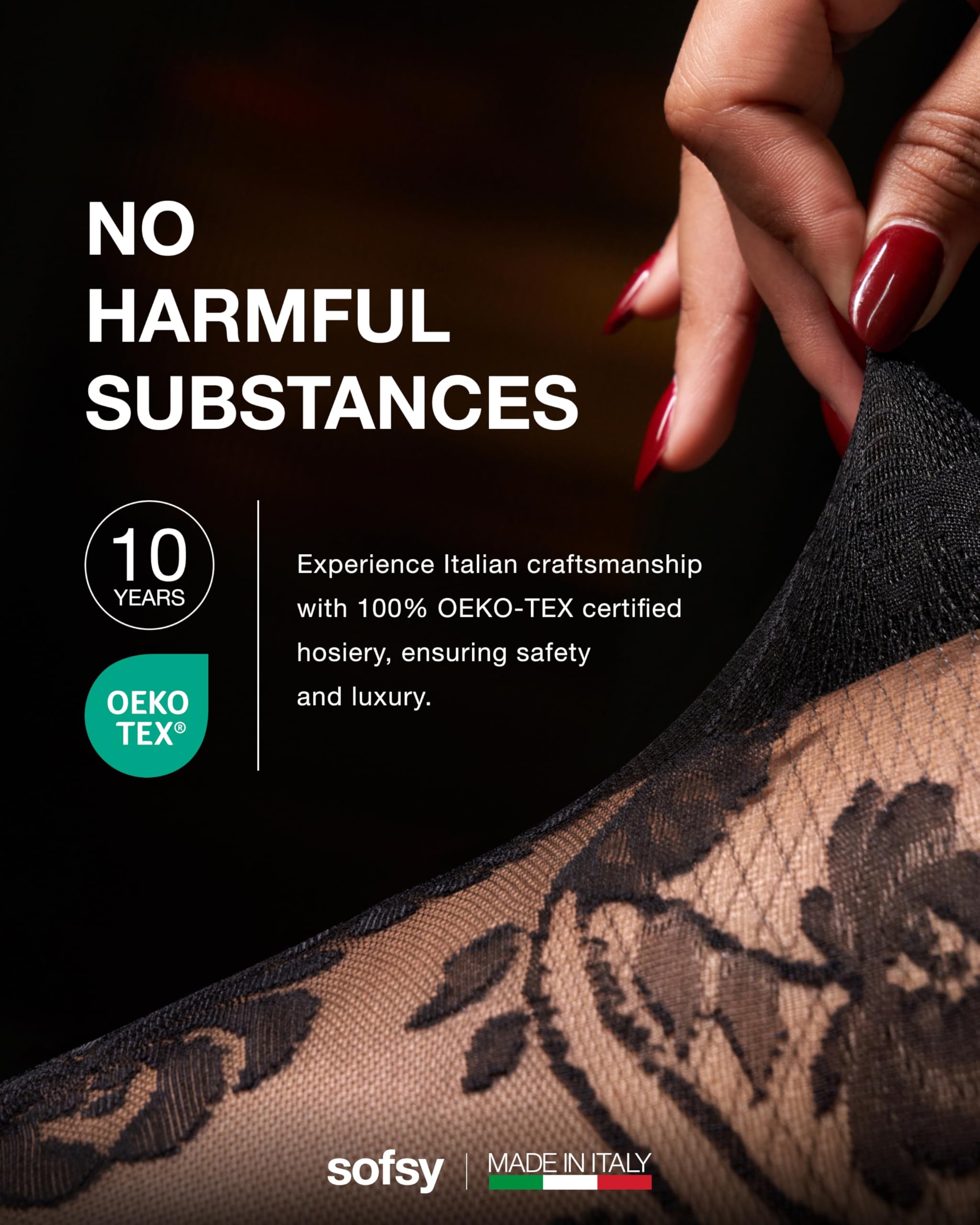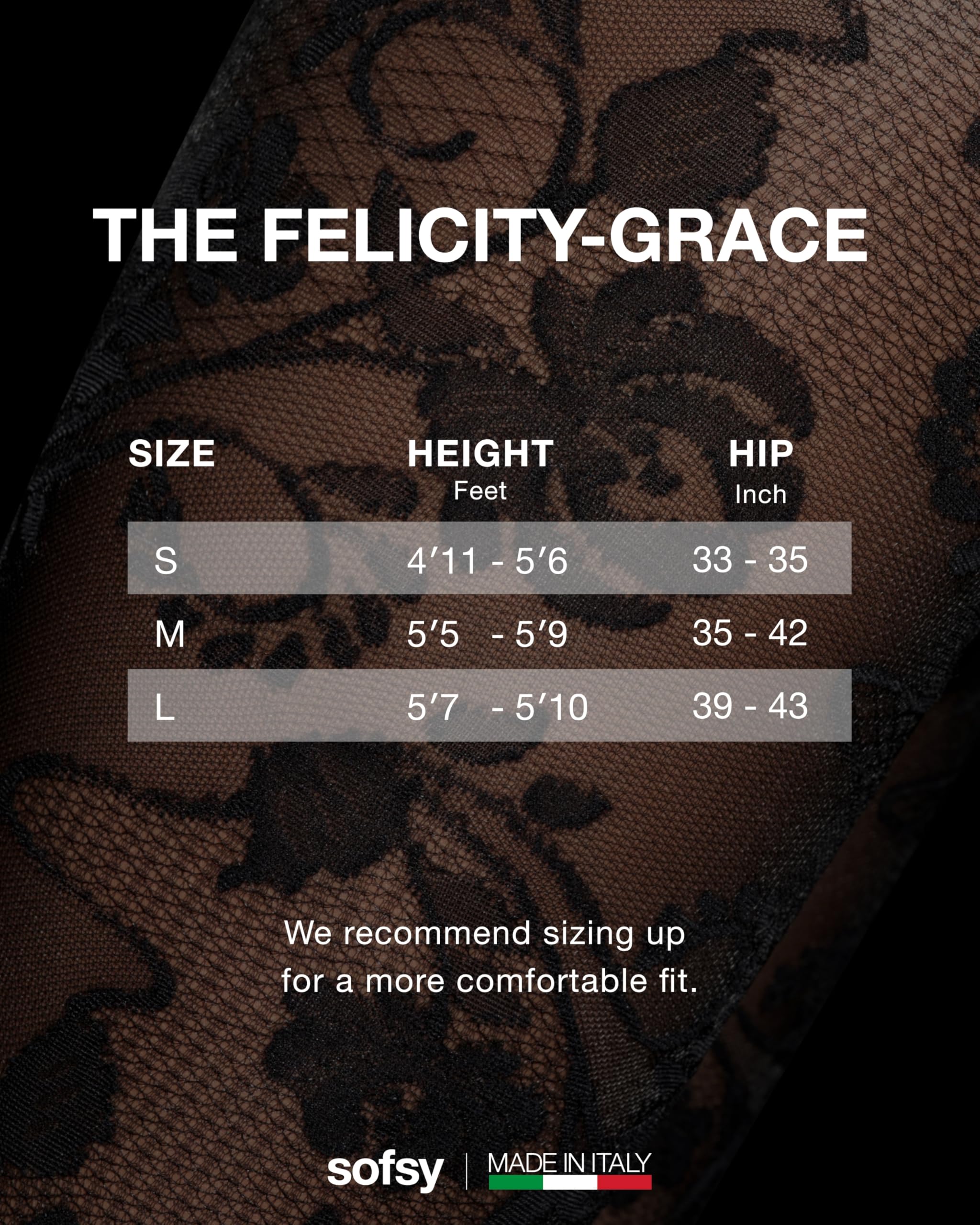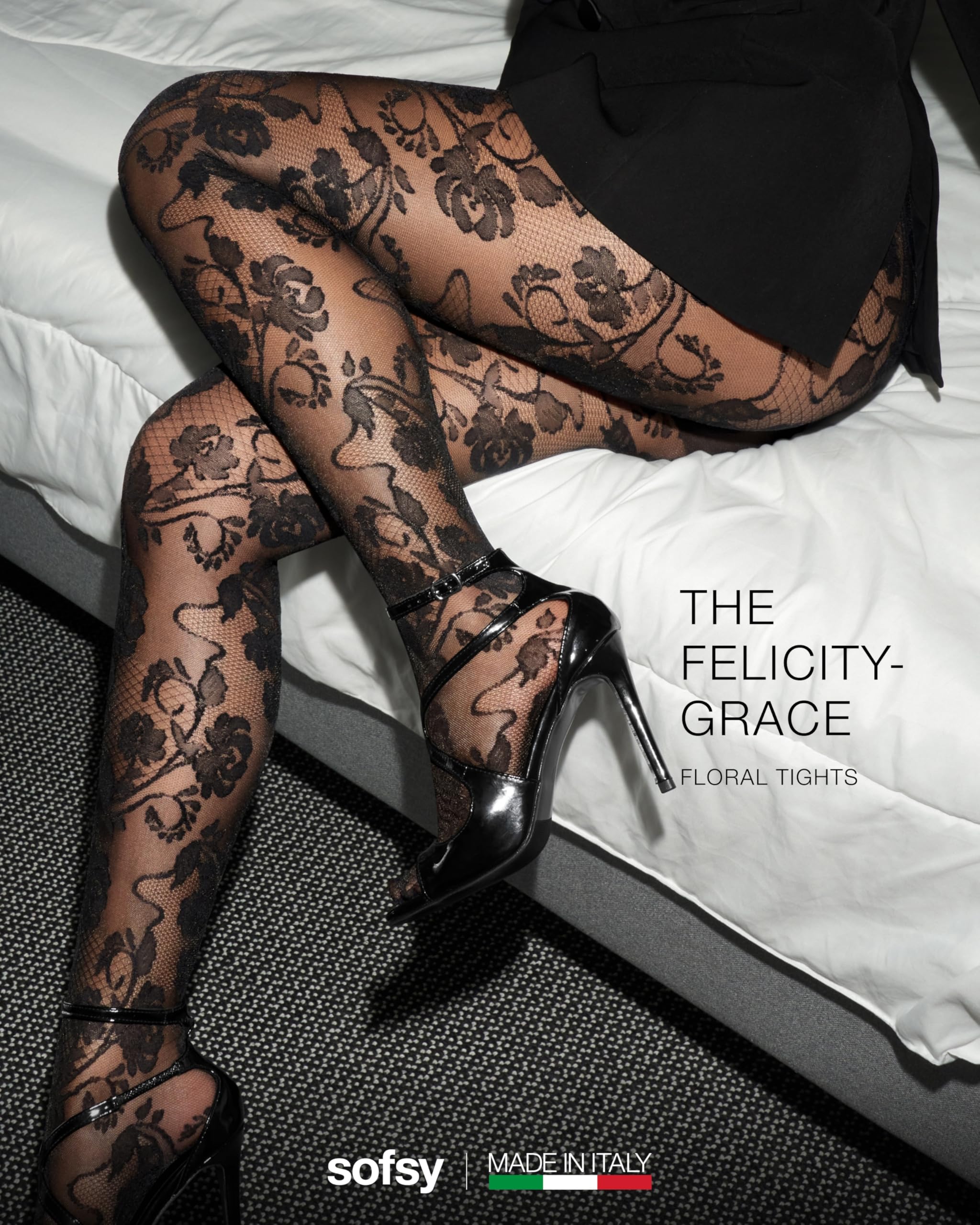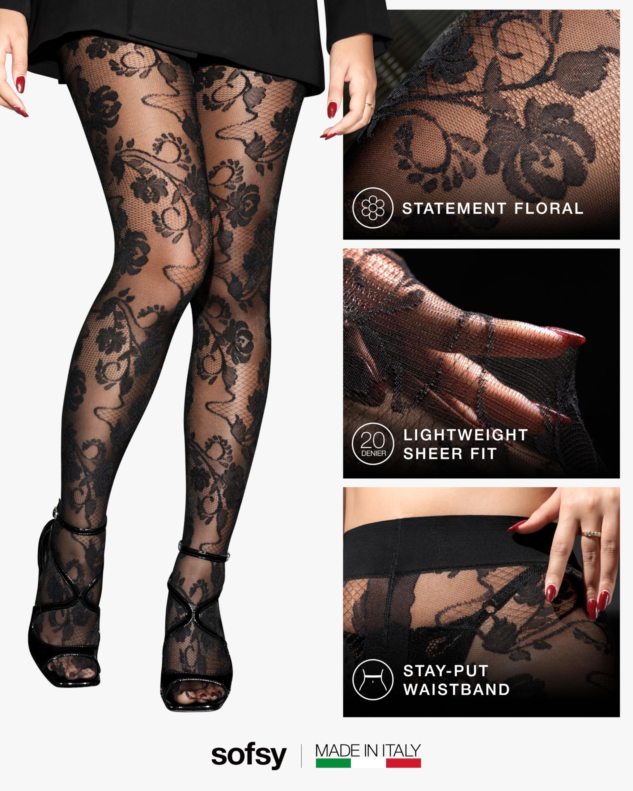 Description Elevate your style with sofsy’s Italian-Made Patterned Tights — where timeless elegance meets everyday versatility, backed by customer-loved comfort and lasting quality. Designed for women who value both beauty and function, our collection includes lace tights, floral tights, diamond patterned tights, and patterned fishnet stockings for women, each crafted in Italy with over a decade of hosiery expertise. Every pair is made from premium, OEKO-TEX certified nylon–elastane blends for a buttery-soft, breathable feel and true-to-size fit that stretches comfortably without digging or rolling. The all-day stay-up high waistband smooths and flatters, while reinforced toes and quality knitting deliver durable, rip-resistant wear that holds up through dancing, layering, and everyday movement. Choose from delicate floral lace tights, bold fishnet patterns, chic diamond designs, or opaque tights with designs — each one finished with intricate patterns exactly as pictured. Whether it’s lace stockings for women sexy enough for date nights, rose tights for a romantic touch, or black tights with designs for sophisticated workwear, sofsy patterned tights adapt seamlessly to every wardrobe moment. Perfect for office wear, party outfits, costumes, and casual styling, these tights pair effortlessly with dresses, skirts, or shorts. With luxurious Italian craftsmanship, inclusive sizing from XS to Large, and versatile patterns, they’re more than an accessory — they’re a style investment you’ll reach for season after season.