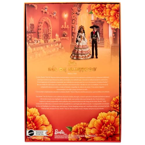 Barbie doll celebrates Día De Muertos in a gorgeous cream-colored gown. Inspired by the colorful cempasúchil (or marigold) flower, which symbolizes the connection between the living and the dead, Barbie doll’s ruffled dress is trimmed with blooming flowers and vibrant ribbons. A cempasúchil crown frames her face and highlights her beautiful sugar skull makeup. This posable Barbie Día De Muertos doll will make a gorgeous addition to a loved one’s ofrenda, along with the complementary Día De Muertos Ken! Doll stand and Certificate of Authenticity included. Doll cannot stand alone. Colors and decorations may vary.