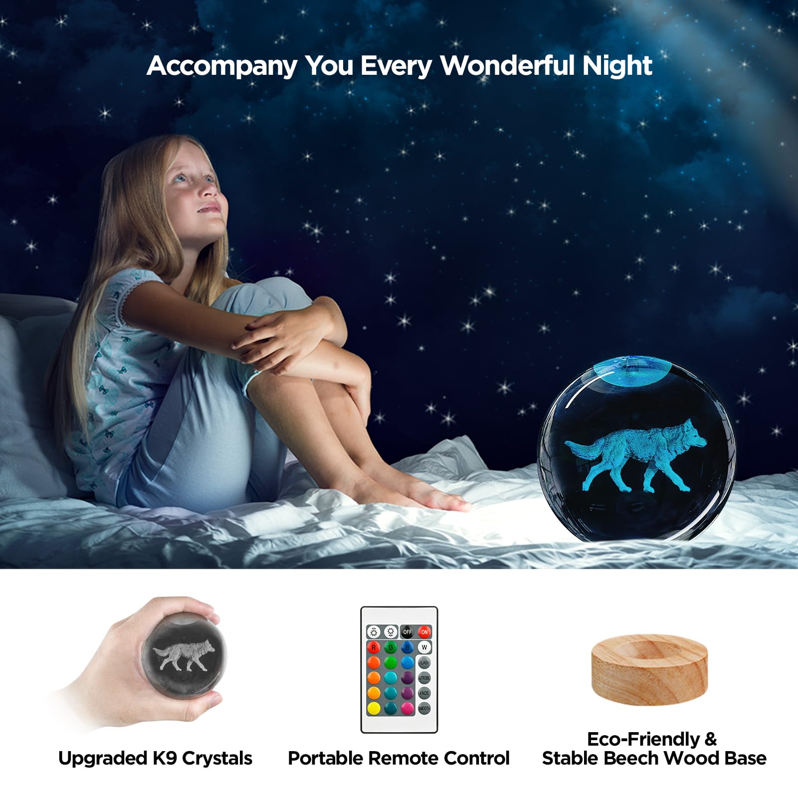 🔮【Package Include】1x Wolf Crystal Ball ( 80mm / 3.15inch ), 1x USB Cable, 1x Beautiful Gift Box, 1x LED LED Wooden. 1 x Remote Control.