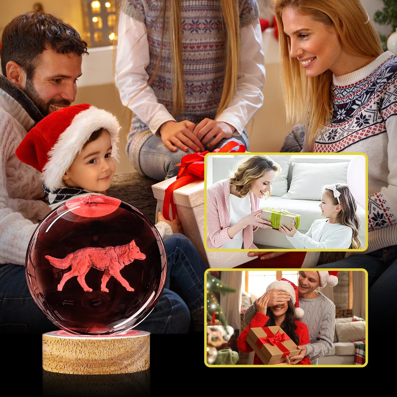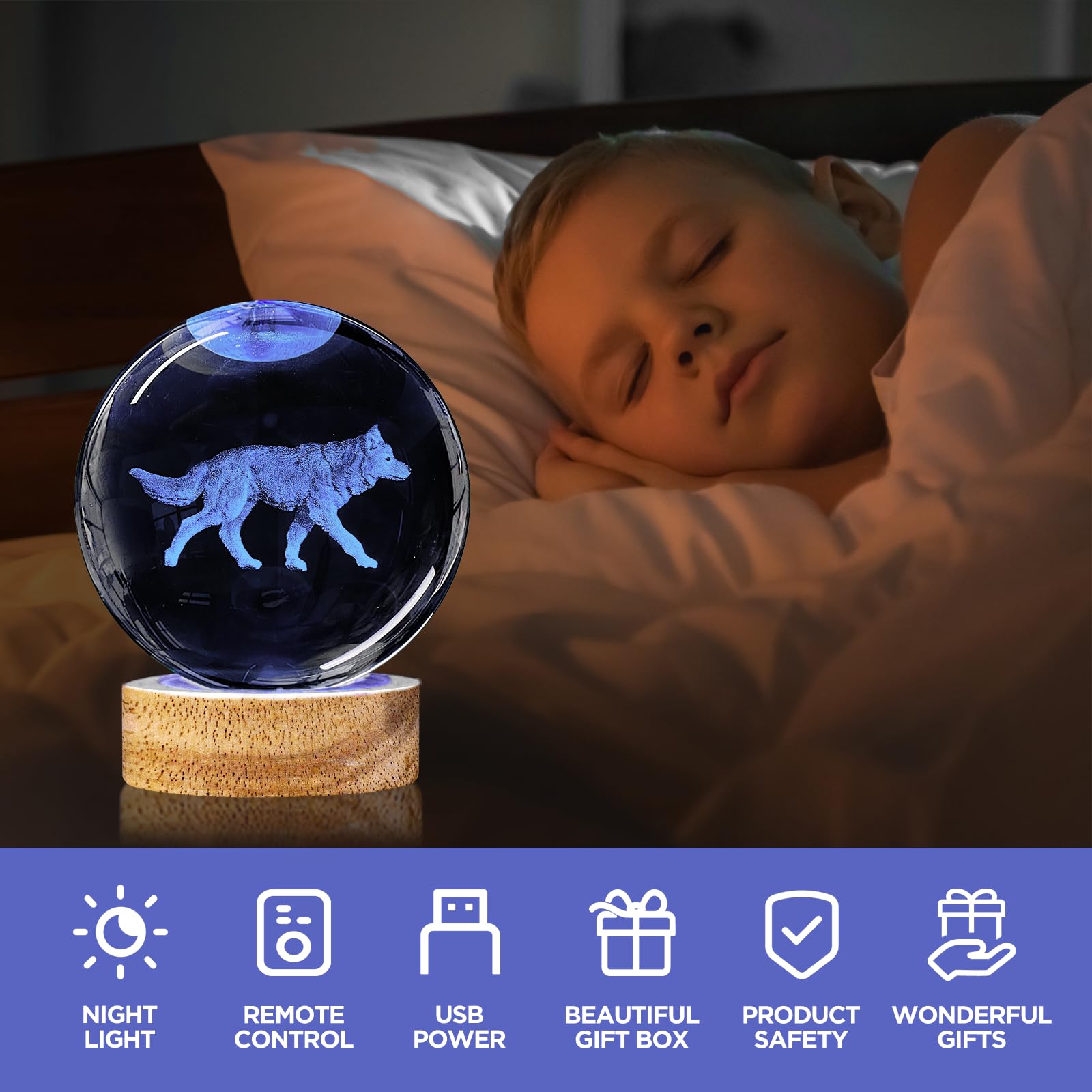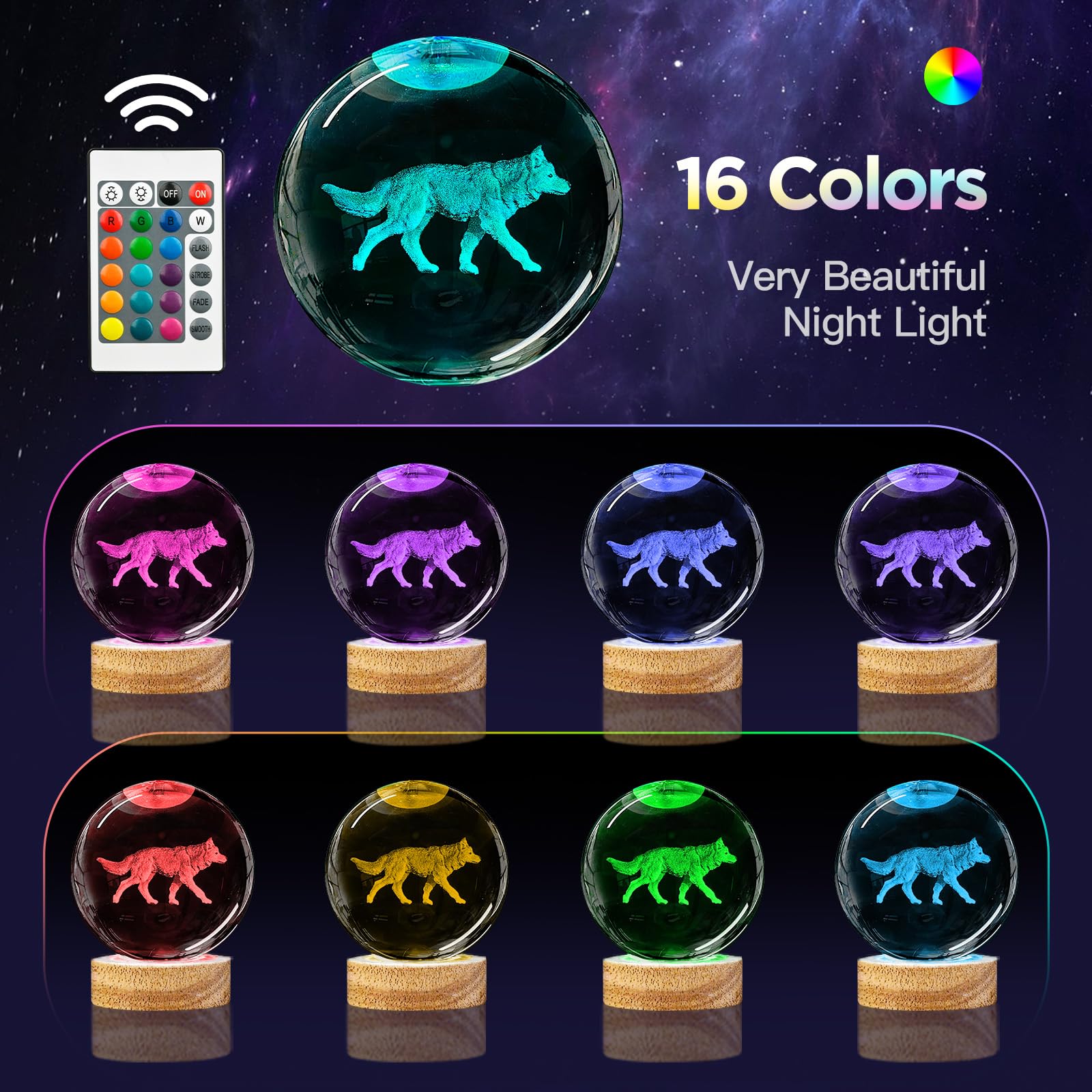 👍3D Wolf Crystal Ball Night Light Lamp with 16 Colors Light, Best Gift for Birthday Christmas, Home Office Decor 💡Specification: Material: High-Quality K9 Crystal Base Material: Eco-Friendly Beech Wood Crystal Size:80*80*80mm (3.15*3.15*3.15 inch) Crystal Weight:0.65kg (1.43 Lbs) Light Color: 16 Colors+4 Modes 💡What You Get: 1 x Crystal Ball 1 x Wooden base 1 x USB charging cable 1 x Remote Control 1 x Microfibre Cleaning Cloth 1 x Exquisite gift box 💡What Makes Our 3D Wolf Lamp Special? 1. Made with k9 highest-quality crystal, making the crystal ball more transparent and glossier. 2. Larger size than other commercially available crystal balls, the diameter of the crystal ball is 3.15 inches(8cm) 3. The 3D laser engraved pattern are stereoscopic, without breaking the surface of crystal, all patterns are clear and distinct. 4. 3D Wolf night light crystal lamp comes with wooden base with usb cable line(no adapter),connect to such as computers, portable charger,output charger/adapter,etc.) 🎁Perfect Gift Pretty unique cool gift for kids, friends and fans - Creative and amazing night light unlike anything you've ever had, perfect for gift giving, especially for kids birthday gift, Christmas gifts, festival gifts or best friend's gift. After Sale Service All 3D Wolf Crystal Ball lamp are carefully checked before sale. We strive to offer our customer the best product and service. Any problem please feel free to contact us for after sale service.