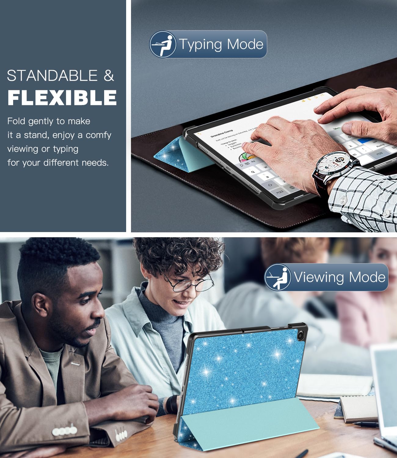 Adjustable Stand Angles: The top of this Galaxy Tab A9 Plus Case folds back to make a stand, which provides a sturdy stand position for both viewing and typing. Free your hands when watching, reading, or writing, a good way to alleviate neck strain