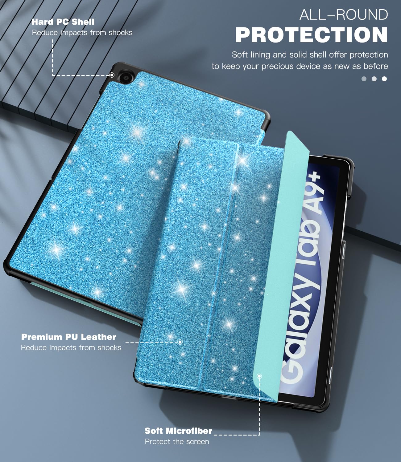 Premium Material: This Samsung A9 Plus Tablet Case is made of premium PU leather exterior, soft microfiber interior lining, and back hard PC cover design protect your tablet against the bumps and scratches of everyday life