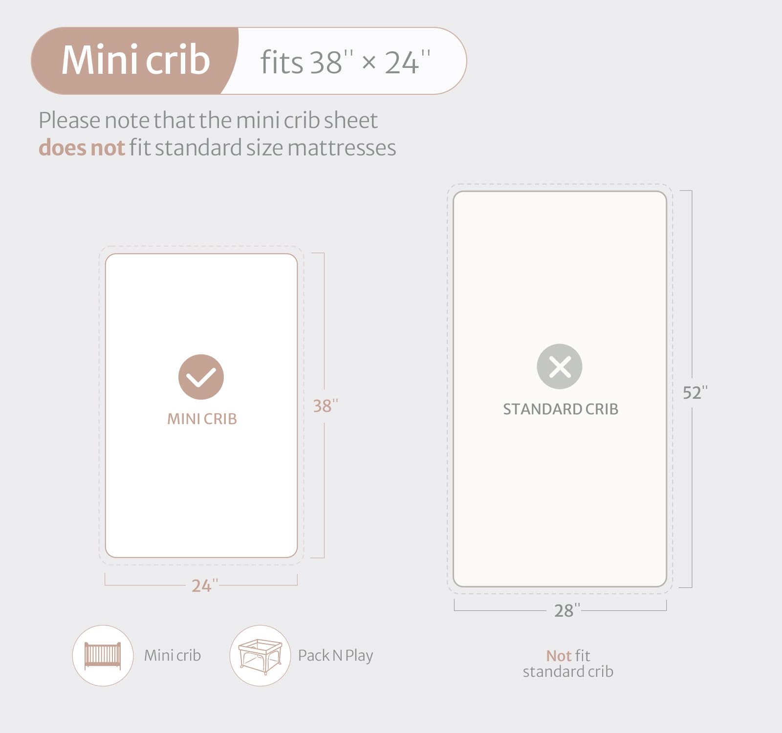 Snug and Secure Fit: Measuring 38 ''x 24 '', the mini crib sheet fits most pack n play and mini crib mattresses for a sung fit. Plus, with an elastic band to keep the bed sheet in place, our pack and play sheet is secure and safe for babies to play