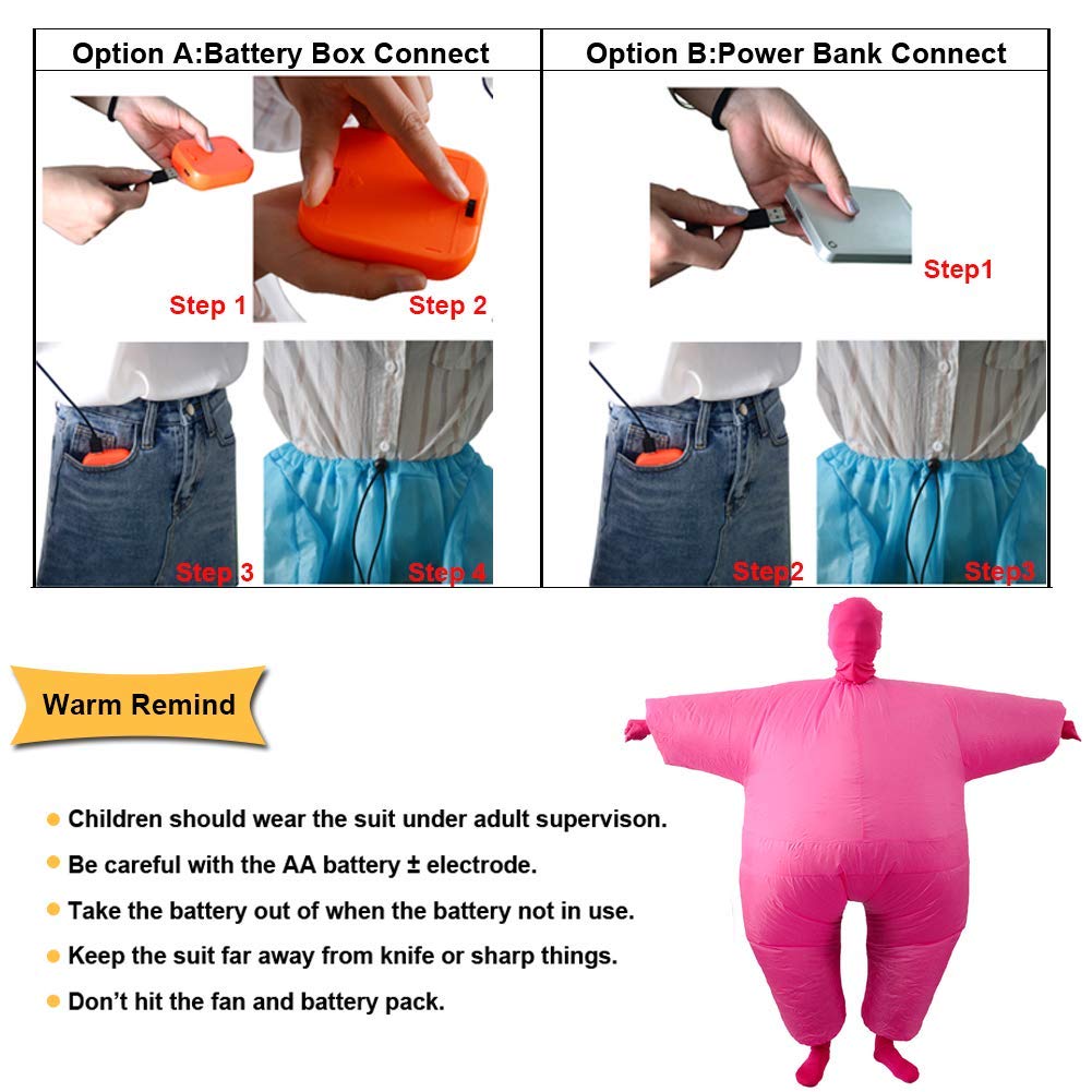 Halloween Costume is blown up by the air pump fan with 4 AA batteries for continuous power supply (batteries not included), or continuous power supply by USB connection with a mobile power supply (not including mobile power).