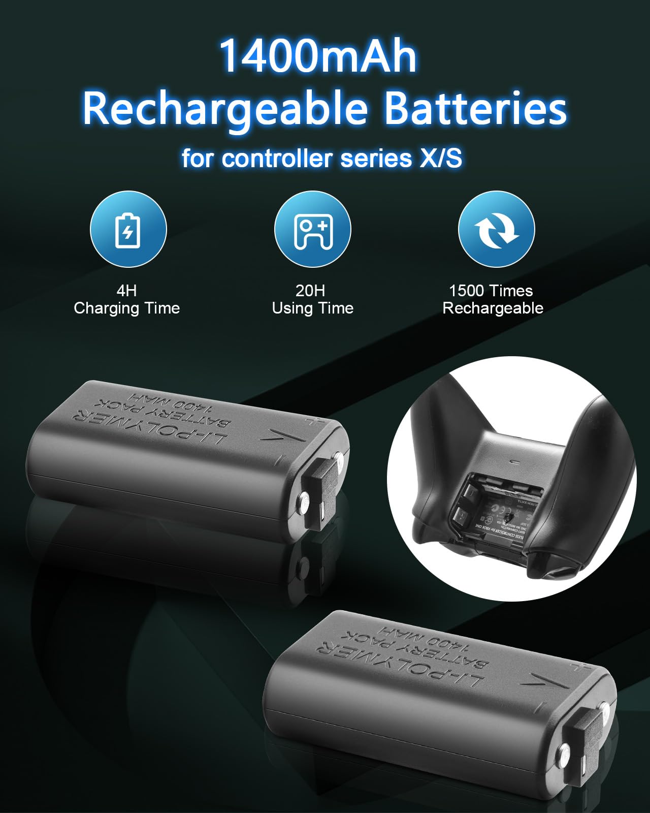 High-Capacity Batteries: We include two 1400mAh batteries as part of our package, allowing you to power up your Xbox Series X/S controllers in just 4 hours and enjoy up to 20 hours of continuous gameplay. With an impressive 1500 recharge cycles, our batteries ensure you can game for a long time without the hassle of frequently replacing them