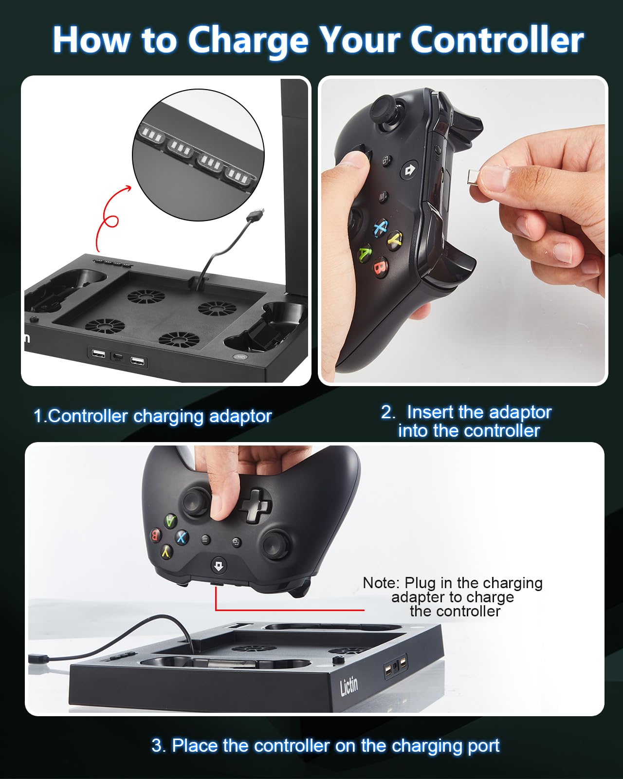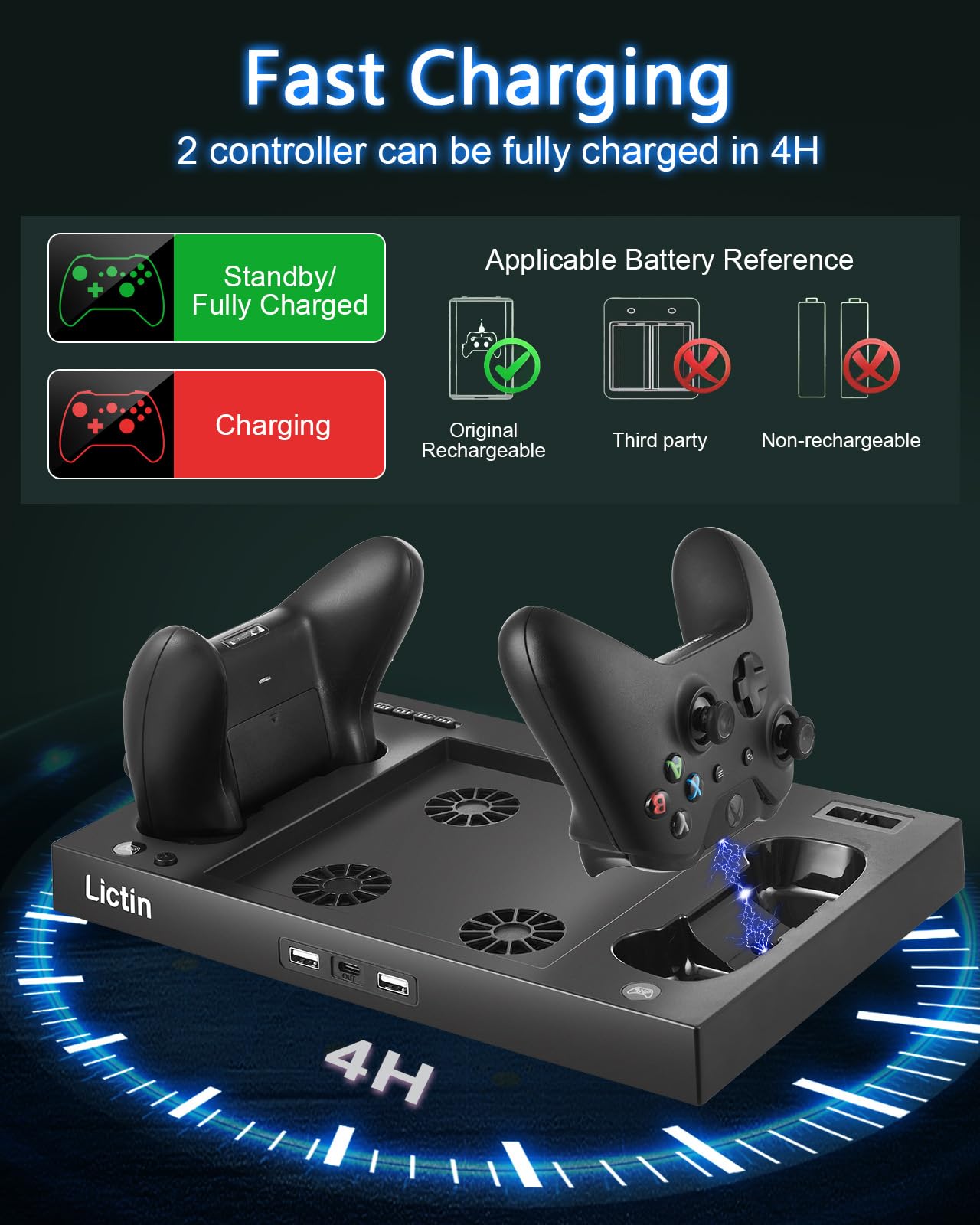 Fast Charging Ports: Our cooling fan for Xbox Series X comes with two convenient charging docks that perfectly fit Xbox Series X/S controllers. Keep your controllers fully charged and ready for action in 4 hours, ensuring you never miss a moment of gaming excitement