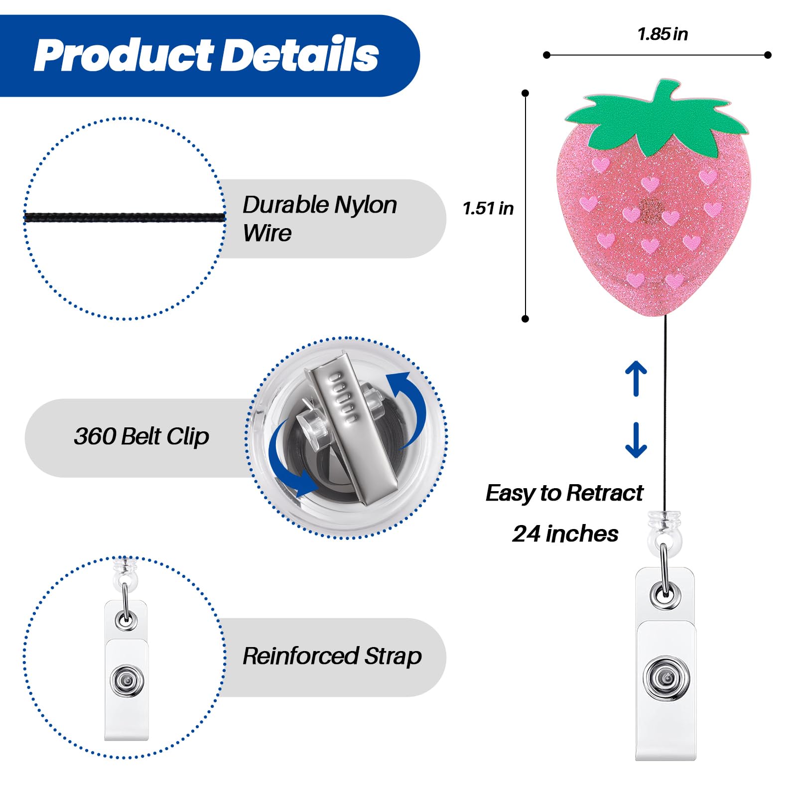 Retractable Cord: The retractable reel cord extends a maximum of 24 inches, more than enough to reach comfortably as far as your arm can reach. The flexible retractable feature enables you to effortlessly display your badge without removing it, enhancing your efficiency at work.