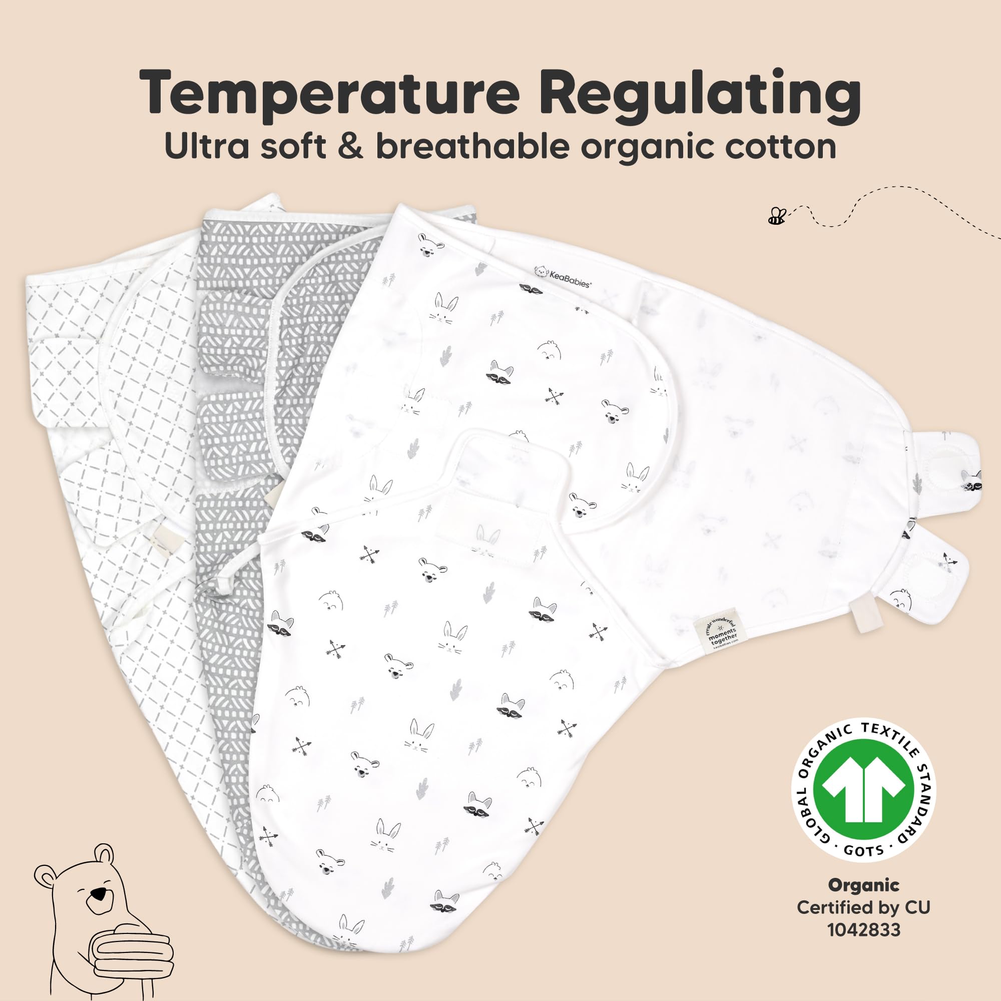 Breathable & Temperature-regulating - Our Soothe Swaddle for newborns is made with ultra-soft Organic Cotton (GOTS Certified by CU 1042833), it is lightweight and highly breathable which makes it a highly-raved newborn swaddle sack for all seasons.