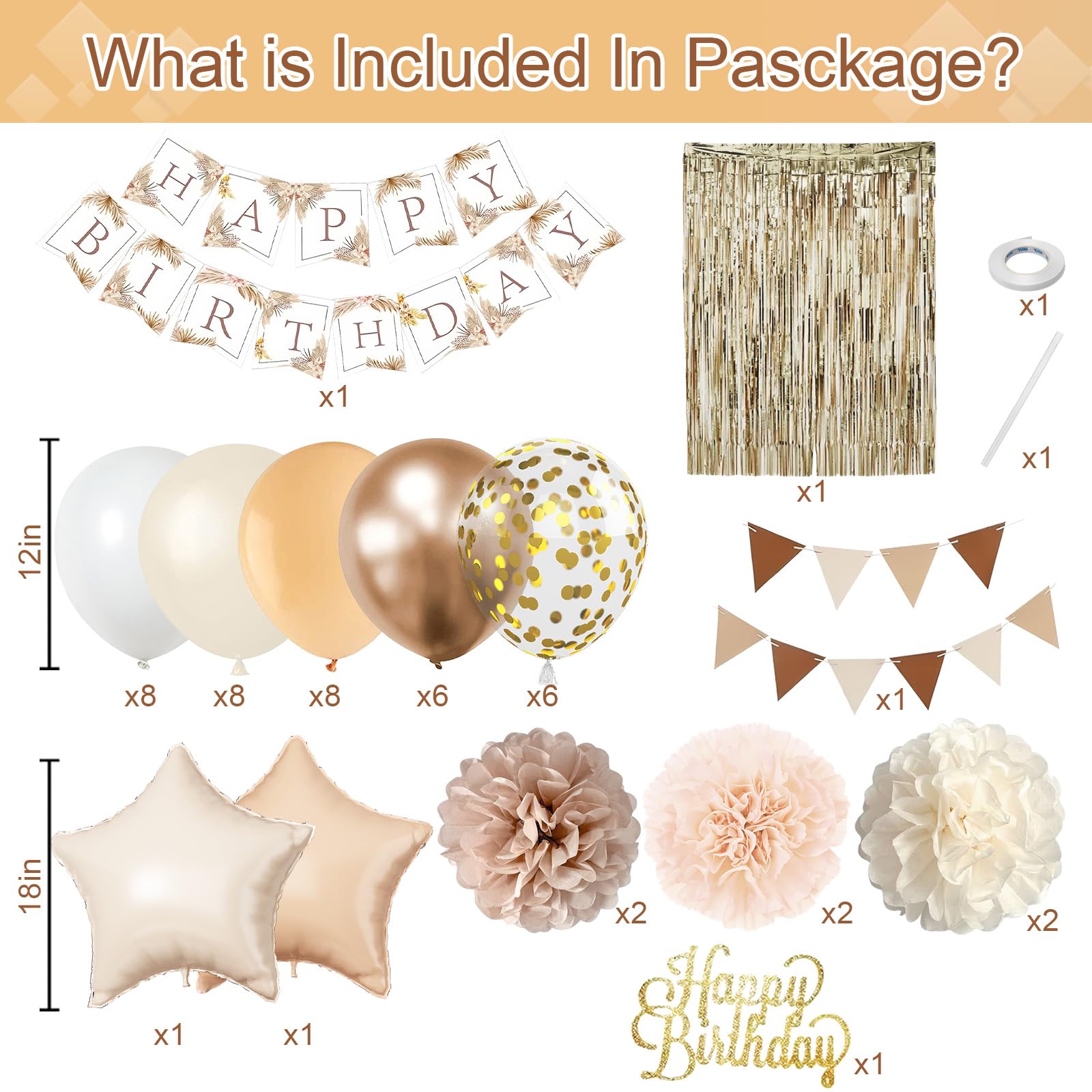 Cream Party Decorations: You will get 1pcs champagne gold foil fringe curtain, 1pc happy birthday banner, 1pc gold birthday cake toppers, 2pc beige tan star foil balloon, 1pc buntting banner, 6pcs pom poms, 36pcs 12inch balloons (8pcs sand white latex balloons, 6pcs champagne gold balloons, 8pcs white balloons, 6pcs gold confetti party balloons, 8pcs nude balloons), 1pc balloon ribbon