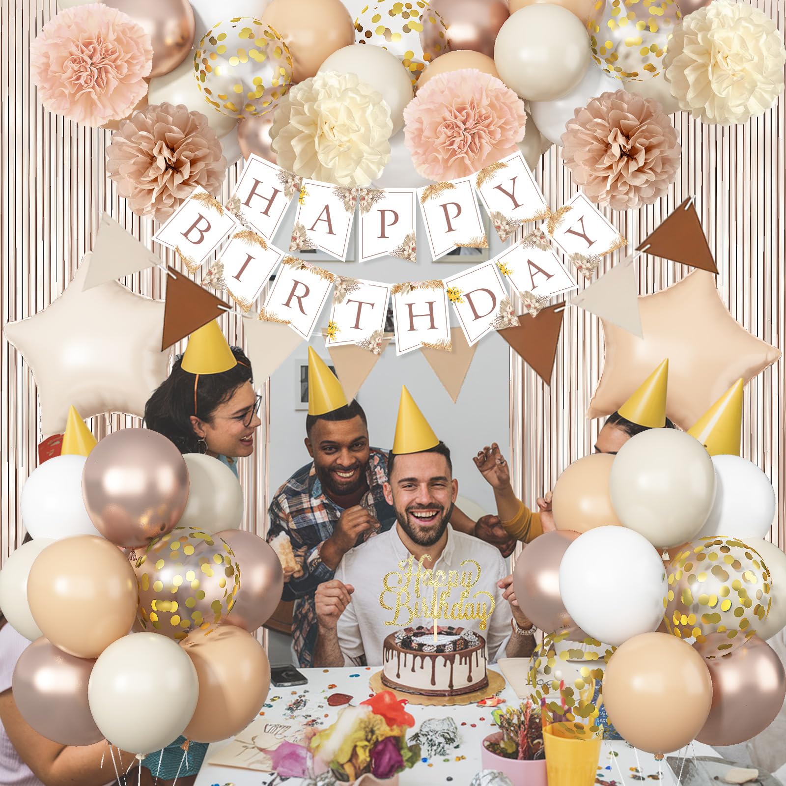 Brown Birthday Decorations for Women Men Boys Girls - Create Unforgettable Celebrations Make birthday a truly memorable occasion with our stunning beige Birthday Party Decorations for her or him. This comprehensive cream white party decoration set is perfect for boho birthday party, wedding party decoration, baby shower, bridal showing, wedding, engagement, anniversary, New Year party decoration etc. Package Included - 1pc 100cm/40inch * 200cm/78.7inch foil fringe curtain 1pc white happy birthday banner 1pc birthday cake toppers 2pcs foil balloon 1pc birthday banner 12inch 36pcs latex balloons 1pc balloon ribbon. Specification- Material: Crafted with high-quality late and thick cardboard materials, our beige gold Party Decorations are built to last and create a lasting impression. The beige cream gold color palette exudes elegance and sophistication, adding a touch of luxury to the celebration. Inflatable- Air or Helium. Large quantity of latex nude birthday balloons set are perfect for creating a stunning balloon arch, balloon garland, or balloon bouquet. You can mix and match the number to create a unique and personalized look that matches your event's theme. Warm Tips - ⚠ Please do not over-inflate the balloon to avoid pop. ⚠ Due to the display of the monitor, the color may be slightly different from the actual item. ⚠ The confetti balloons come with confetti inside. After inflating, please rub carefully with carpet, silk, hair and roll the balloons.