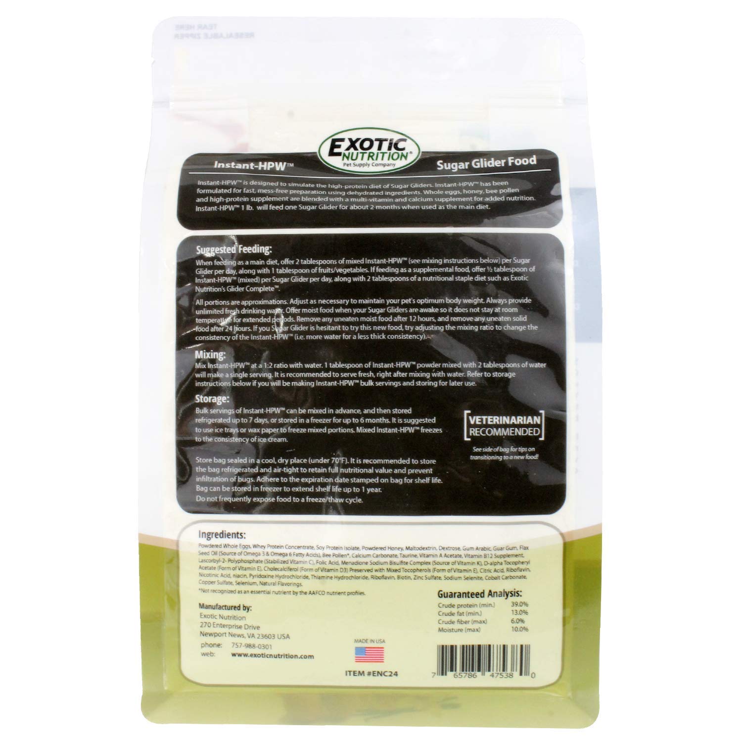 Exotic Nutrition's Instant-HPW is a favorite among glider owners. Instant-HPW includes the major ingredients from the original homemade HPW diet that is trusted and fed to sugar gliders worldwide. This homemade diet has been formulated into an easier, mess-free, pre-mixed form using dehydrated ingredients, and then fortified with Exotic Nutrition's Glider Booster (multivitamin) and Exotic Nutrition's Glider-Cal (calcium supplement) for added nutrition. SIZE: 18 lb. FEATURES: ✔ NUTRITIOUS - Vitamin-enriched sugar glider diet, delicious vanilla flavoring ✔ CONVENIENT - Mixes with water...quick and easy to make fresh diet ✔ NATURAL - Natural ingredients include honey, eggs, bee pollen and Exotic Nutrition's ZooPro high protein supplement ✔ EASY - No washing, chopping or cutting fresh ingredients - simply mix with water ✔ EASY TO STORE - Serve fresh or freeze into individual servings Mixing Instructions: 1:2 ratio (1 tbsp of Instant-HPW powder with 2 tbsp of water). It is recommended to serve fresh, right after mixing with water. View the additional photos to see approximately how long a bag will last. 1 cup of Instant-HPW powder (mixed with 2 cups of water) will make approximately 16 servings when fed as the main diet and can be store in the refrigerator up to 7 days. If storing mixed formula for longer than 7 days, freeze (up to 6 months) using ice trays. Instant-HPW freezes to the consistency of ice cream. Storage Instructions: Store sealed in a cool, dry place. Refrigeration is strongly suggested. Powdered formula can be stored in freezer for up to 1 year.
