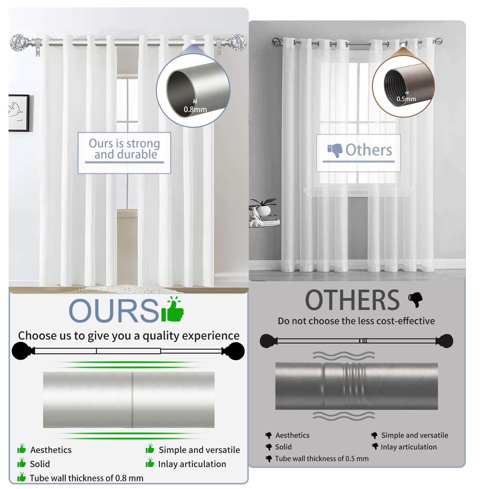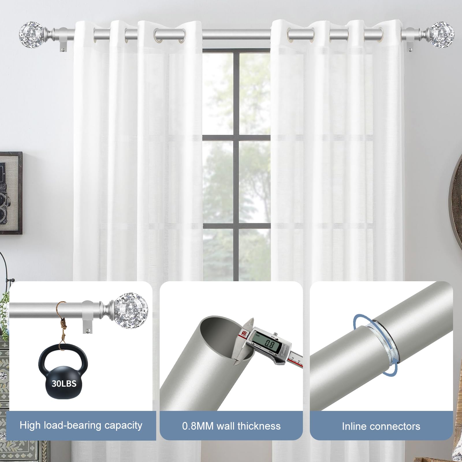 【 TVWOO Heavy Duty Curtain Rods 】Thickened high quality curtains rods are made of iron with iron brackets and sturdy screws.3/4 Inch diameter adjustable heavy duty curtain rods wall thickness of each rods are 0.8mm. Each rod is treated with proven baking paint process,each set of silver window curtain rod is equipped with a high-quality metal iron bracket, to ensure that the curtains rods will not be bent or drooped, the maximum load bearing of about 30 pounds.