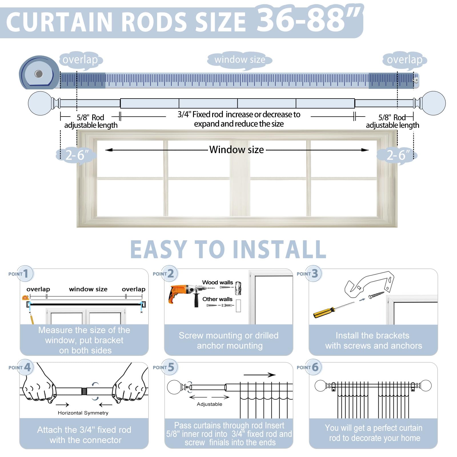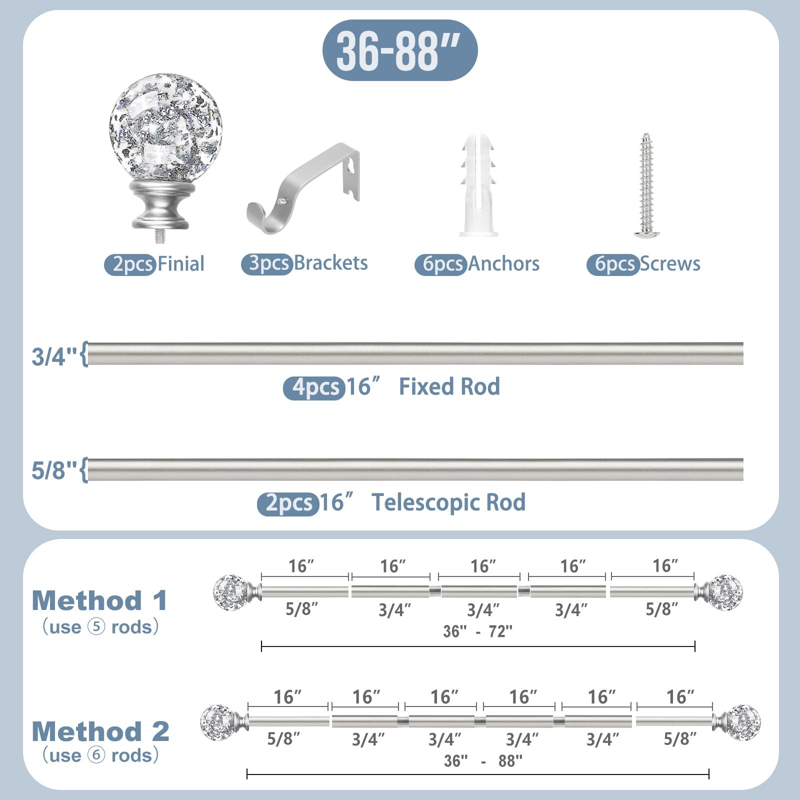 【 TVWOO Curtain Rods for Windows 48 to 84 inch(4-7ft)】 Silver drapery rods include 4 x 16" x 3/4" fixed rods, 2 x 16" x 5/8" adjustable rods, 2 x finial,3 x bracket, 3 x connector, 6 x anchor, 6 x screw.Silver curtain rod for windows can extend from 36 to 88 inches, choose the right size curtain rods according to the length of your window.