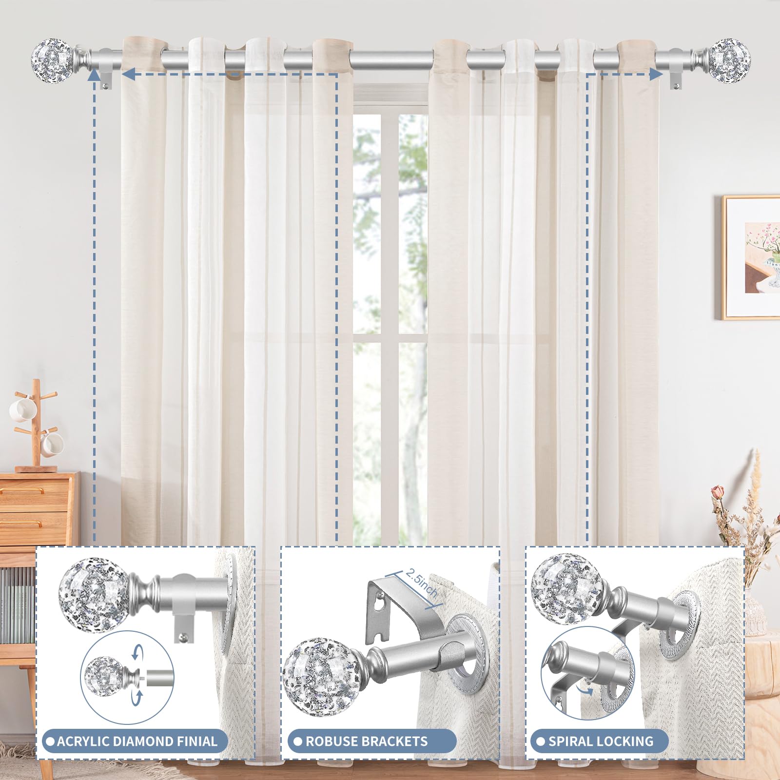 【 TVWOO Easy to Install】Each set of adjustable curtain rod set comes with colorful installation instructions and all the accessories needed (the instructions include a parts diagram and assembly diagram). Easy to install, follow the step-by-step instructions, silver single window rods can be quickly completed installation.