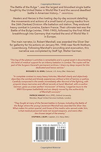 The Battle of the Bulge “... was the largest and bloodiest single battle fought by the United States in World War II and the second deadliest battle in American history ..." — Wikipedia Healers and Heroes is the riveting day-by-day account detailing the movements and actions of 22 men from the 26th (Yankee) Division rifle battalion aid station. After landing on the French coast of Normandy in September 1944, they endured heavy combat in Lorraine, Eastern France. Their ultimate test was the Battle of the Bulge across the Ardennes during the winter of 1944–1945, followed by the final Allied breakthrough into Germany that marked the end of World War II in Europe. Main narrator Lt. Robert Marshall was awarded the Silver Star for gallantry for his actions on January 9th, 1945 near North Nothum, Luxembourg. Following Marshall’s wounding and evacuation, this narrative was completed by Staff SGT Walter German. "The log of the platoon’s activities that was kept by Robert Marshall is remarkable and is a great asset in documenting this level of medical support for an infantry battalion in combat. The copies will be part of the Surgeon General’s permanent archives. I share my deep respect for his dedicated and heroic service." — Richard V. N. Ginn, Colonel, U.S. Army (Ret. Historian) "In complete contrast to many heavy histories, Marshall clearly and objectively describes the combat and bloody experiences without a hint of heroics or pathos. Carefully composed and written by Marshall, with co-author German, in the weeks immediately after the end of the fighting, while they still had pinpoint sharp memories and official records at hand, this account gives us a near perfect 'microcosm' of history. I organize tours to the WW II European battlefields, and am deeply moved by the authenticity of thus account." — Patrick Hinchy, M.A. (P.P.E.), Oxford University Member, Chatham House, London Member, Royal United Services Institute, London "They fought at many of the fiercest battles in Europe, including the Battle of the Bulge where the young Lieutenant Marshall was awarded the Silver Star. What makes his action special, and those of the medics who served under him, is that medical personnel were not issued weapons, and were often the chosen target of the enemy." — Stephen J. Bury, Captain, U.S. Navy (Ret.)