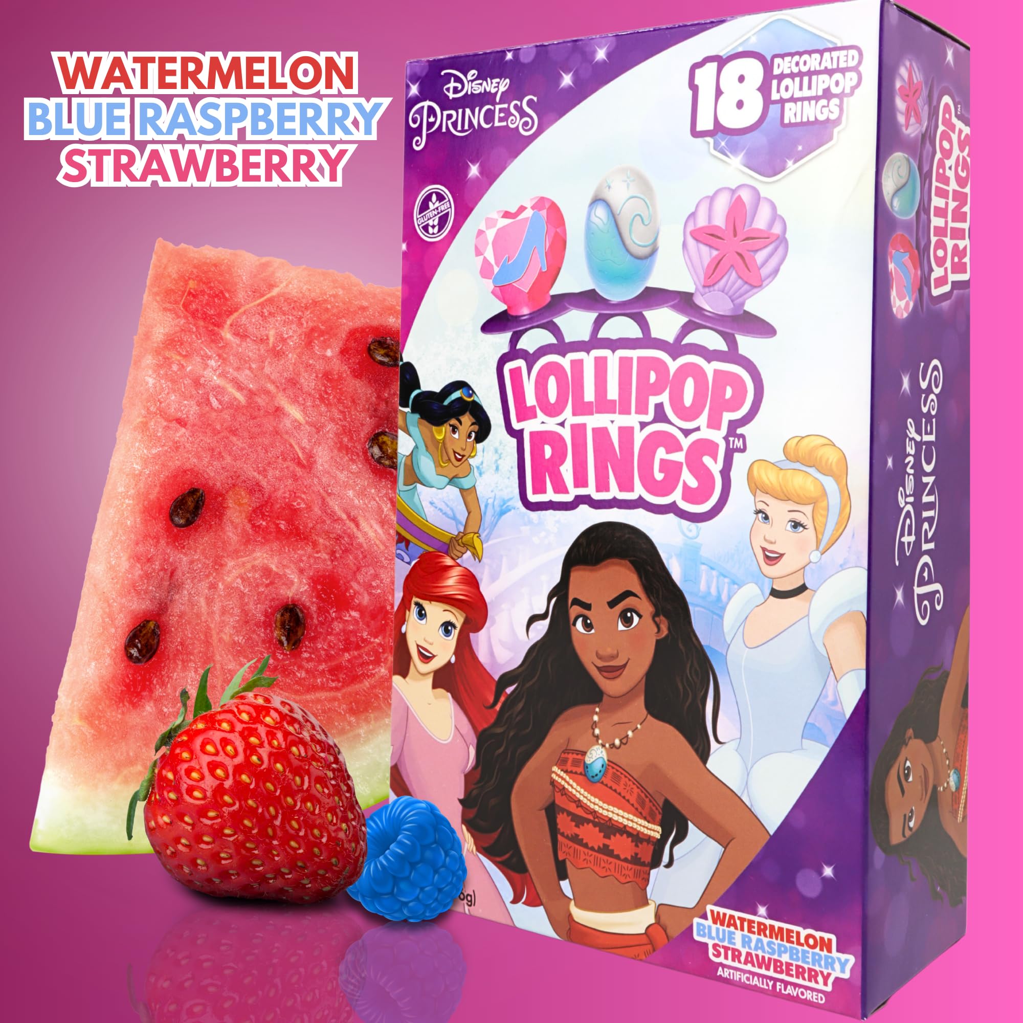BULK CANDY: Box is 7.61 Ounces, 18 Decorated and individually wrapped lollipop rings in each box. Perfect birthday party favors and classroom exchange goodies. LOLLIPOP RINGS are the perfect goodies to take for classroom exchanges! FUN FOR ALL: The iconic lollipop rings with a magical Disney twist. Classmates will love these fun and festive lollipop rings! ASSORTED FLAVORS: Flavors include watermelon, grape and strawberry. ASSORTED FLAVORS: Flavors include watermelon, grape and strawberry. Each individually wrapped lollipop ring has a place to include to and from. Intended for Ages 15 and Up