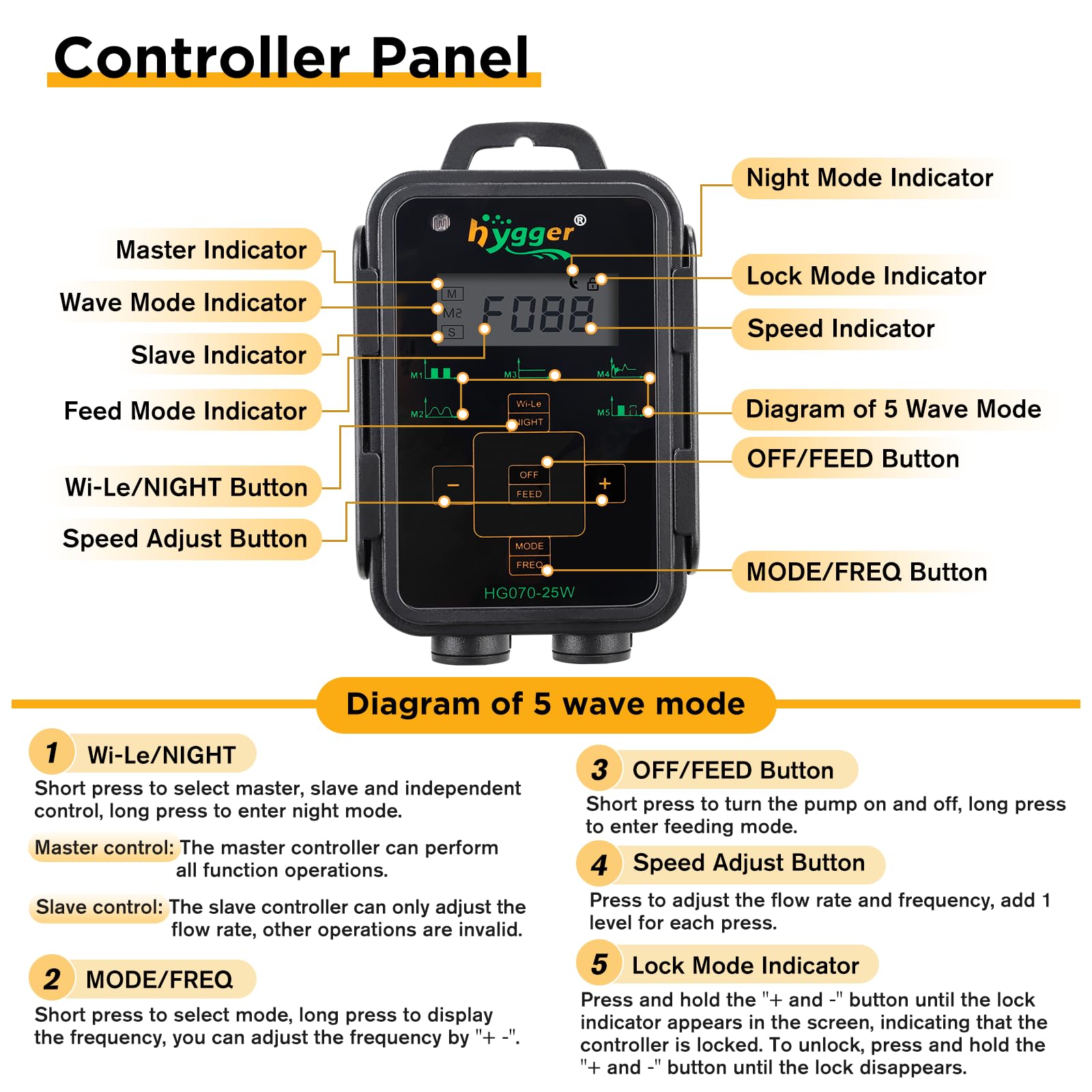 🐠INTELLIGENT LED CONTROLLER - With LED display controller, you can set it to different modes to simulate natural living environment 1) 5 wave modes available - pulse wave, sine wave, constant wave, random wave, cross flow wave; 2) 30-100 flow rate levels options; 3) 30-100 frequency levels options; 4) feeding mode; 5) night mode; 6) linkage mode