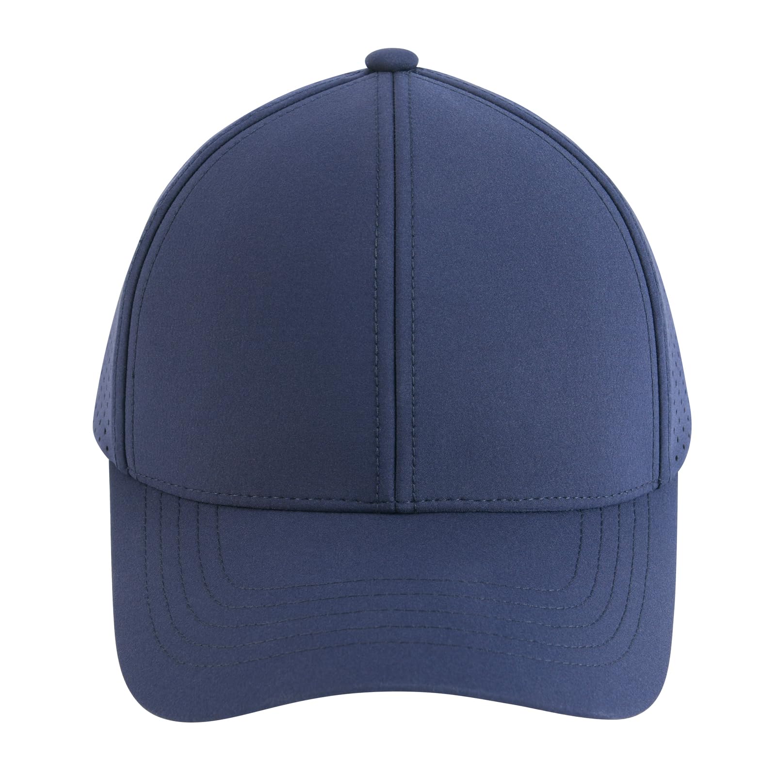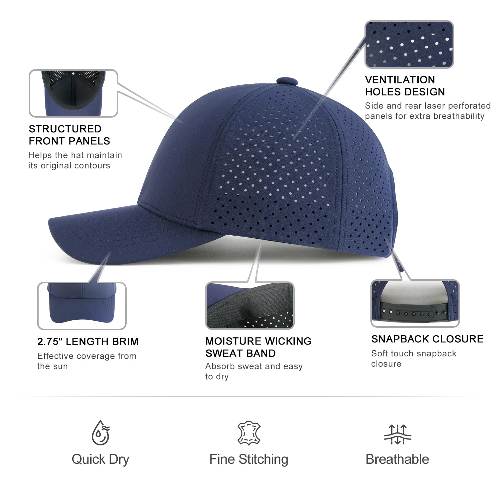Design: structured front panels, 6-panel cap, curved brim, laser-perforated side & rear panels for breathability, and soft touch snapback closure