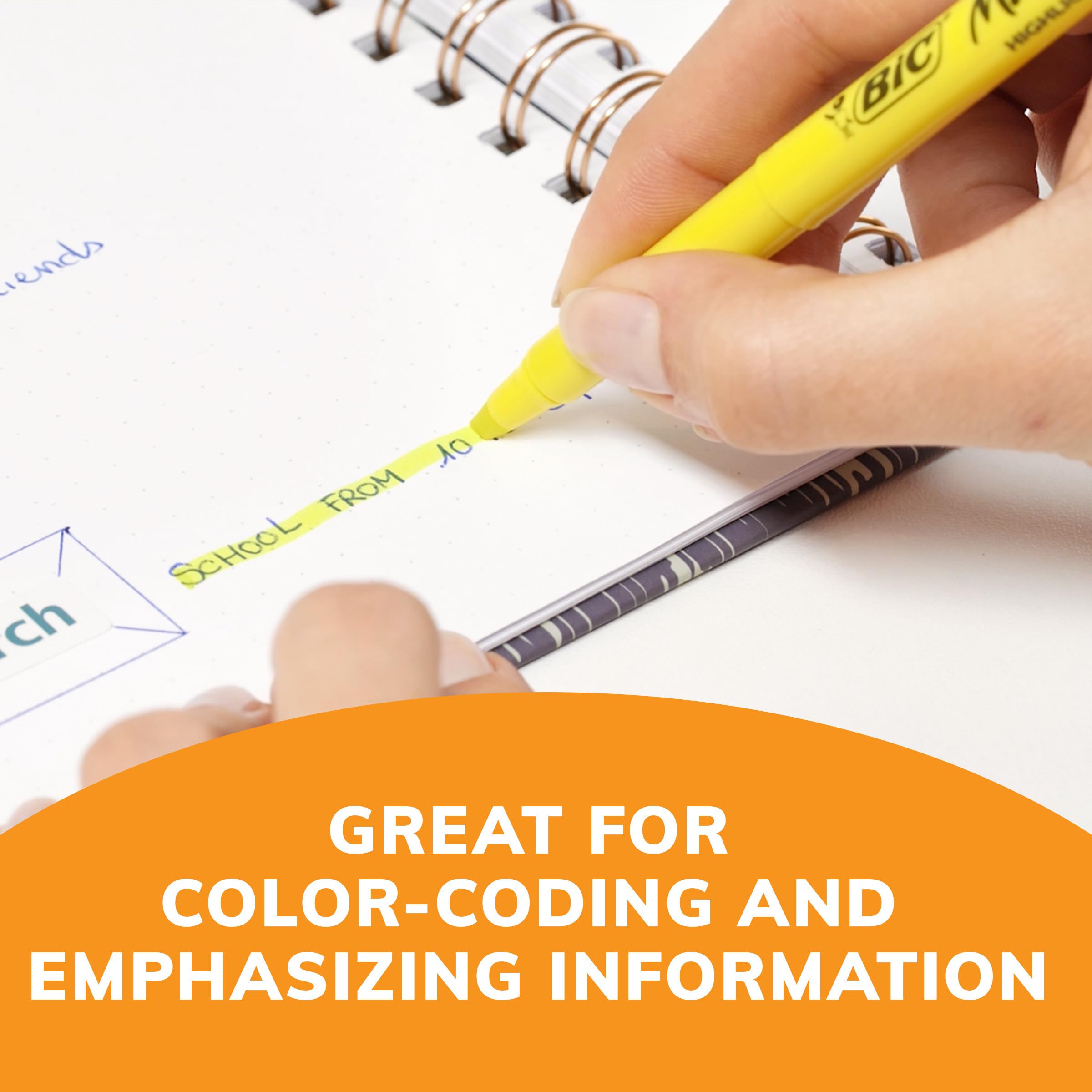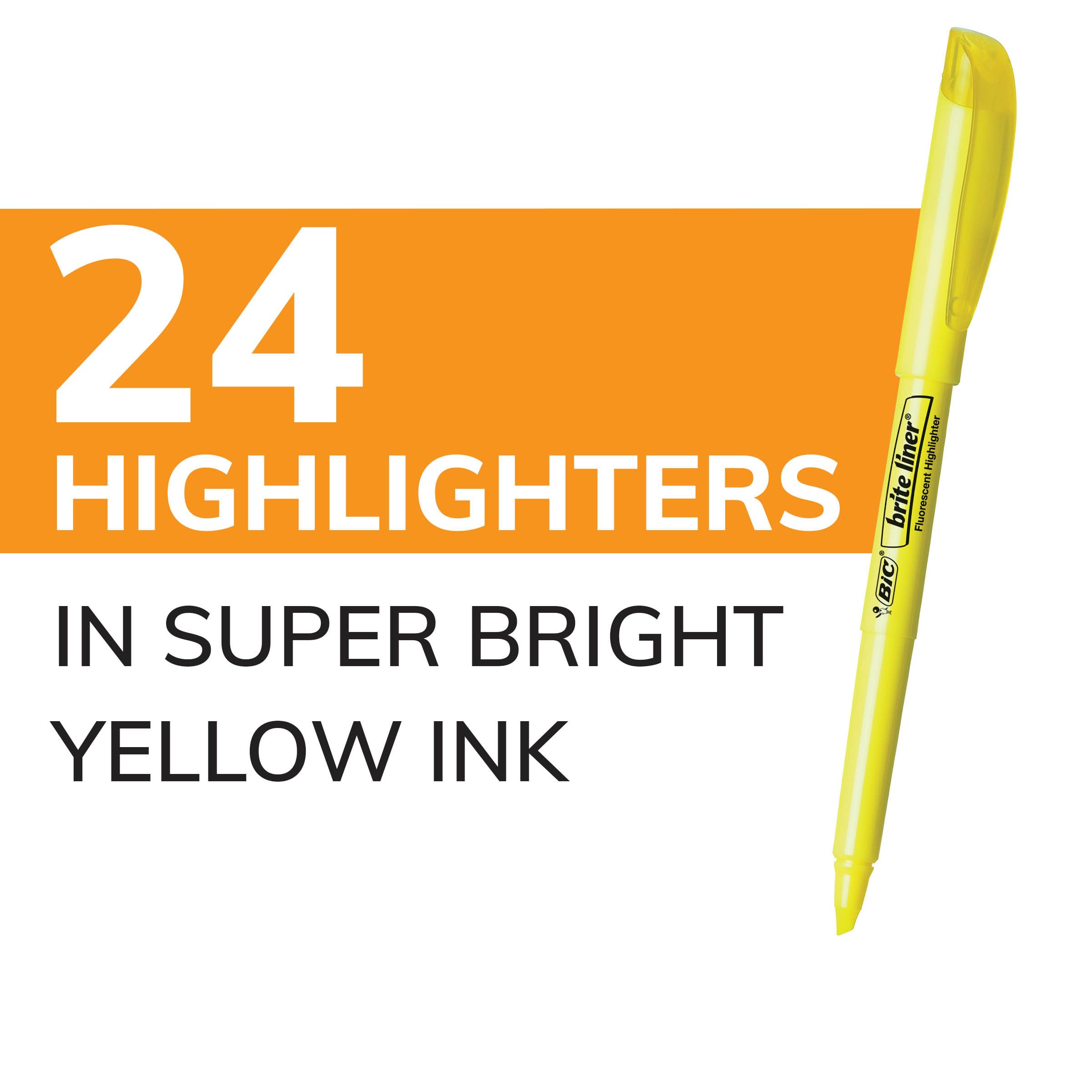 Make organization fun and easy with the BIC Brite Liner Yellow Highlighter Set. These highlighters have a chisel tip for broad highlighting or fine underlining, making them perfect for highlighting school or office documents. BIC's highlighter markers use translucent ink to emphasize what’s important on the page without obscuring the text below. Reliable and long-lasting, each BIC Brite Liner highlighter writes for up to eight hours without a cap and does not dry out, so you can work with confidence. The convenient pen-shaped highlighter design lets you easily grip and comfortably use the highlighters to organize your notes or underline passages in textbooks, notebooks and documents. Looking for classic highlighters for journals or yellow marker sets for adults? BIC Brite Liner Yellow Highlighters add a fun pop of color to your art, office or school supplies. Each pack contains 24 highlighters chisel tip markers in yellow coloring. BIC highlighters are ACMI-approved for a high-quality, safe product you can trust. Whether you’re emphasizing text, or just feel like getting creative, choose BIC Brite Liner Highlighters.