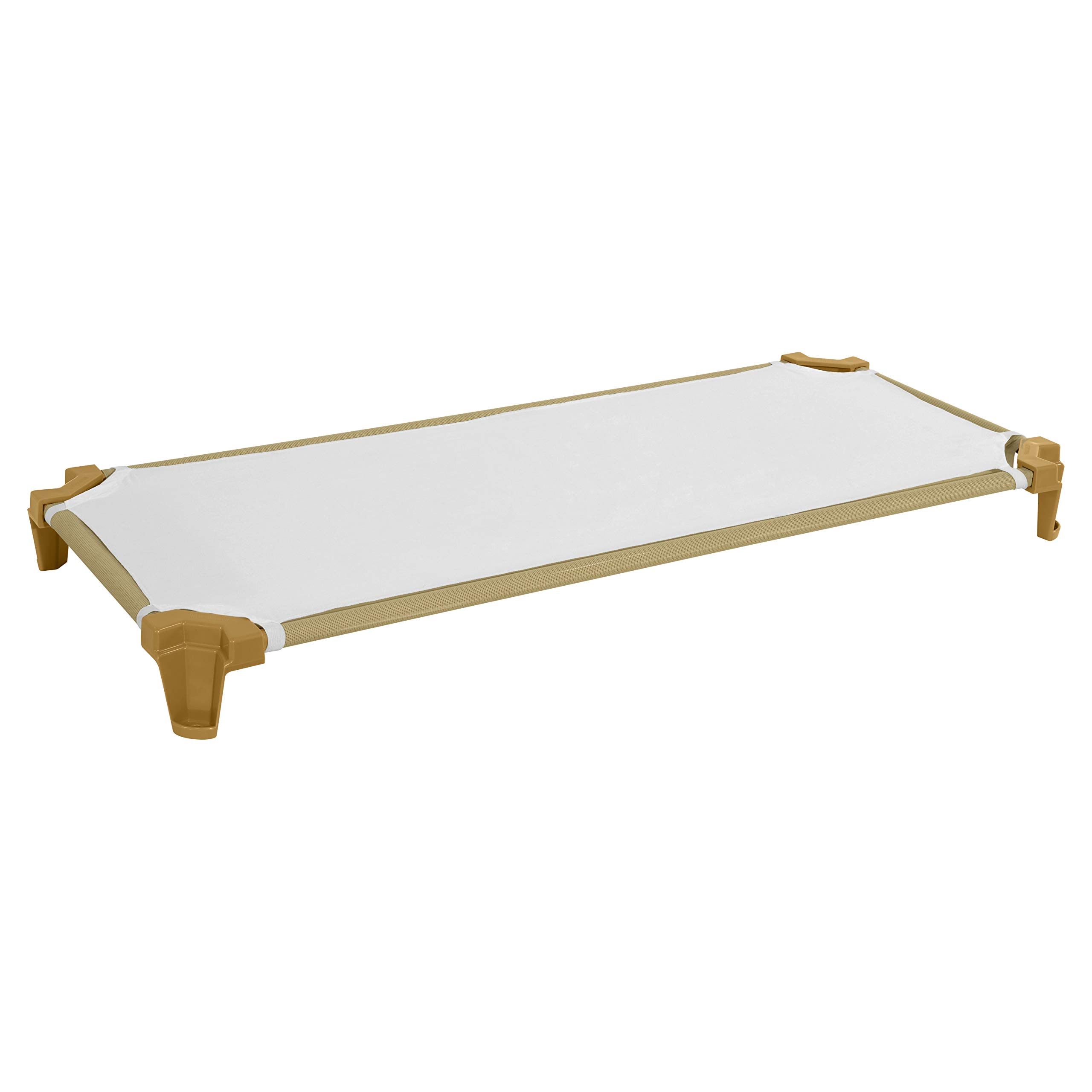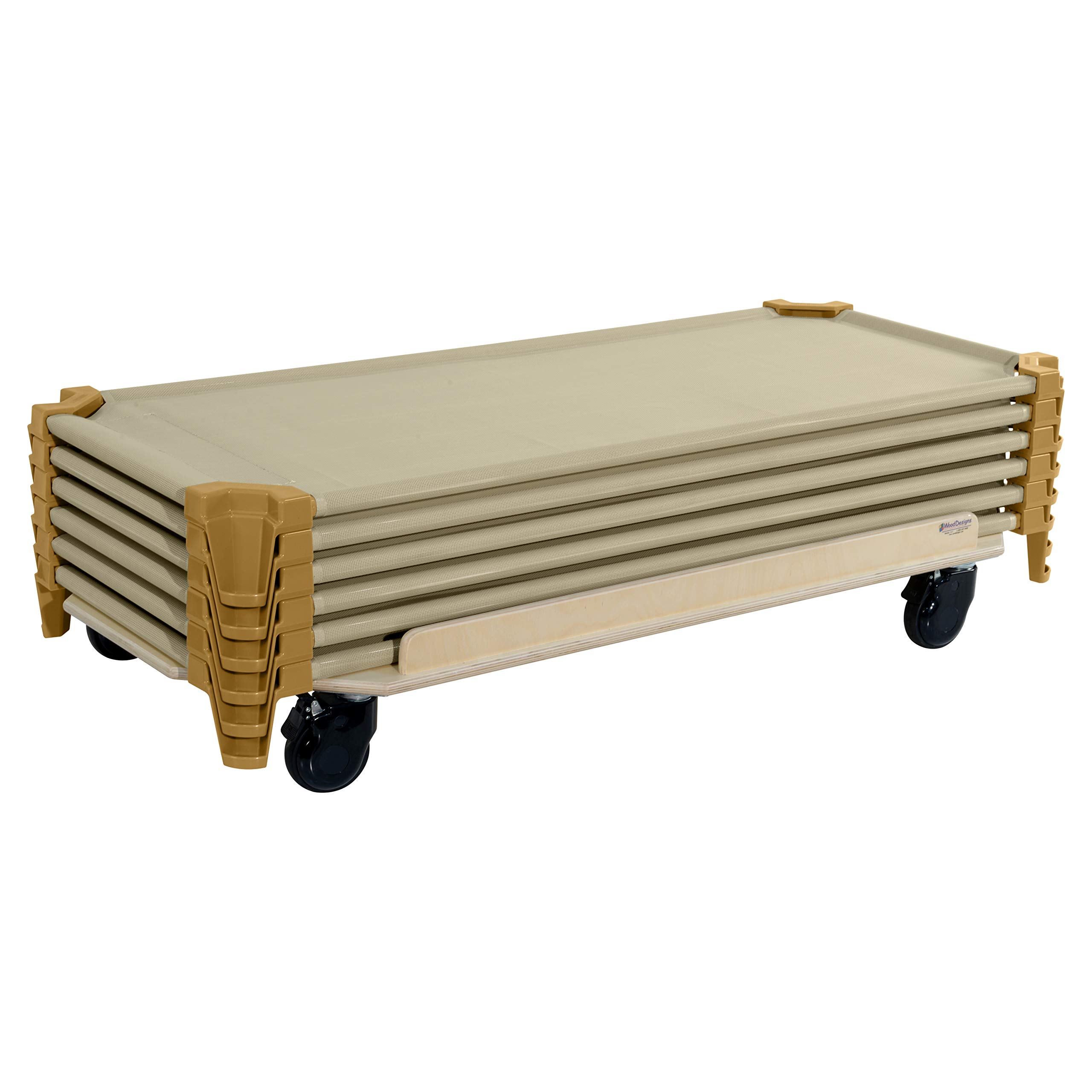 Preserve valuable classroom space with Wood Designs' space saving cot design in Tan. Children will rest comfortably with strong anti-sagging vinyl mesh fabric and extra strong ABS plastic for all corners featuring excellent impact resistance, strength, and toughness. Our cots are heavy duty, powder coated Tan, with 16 gauge metal bars that won't bend from use, and a combination of heat sealed and sewn seams for ultimate durability. Vinyl mesh fabric is removable and machine washable with hook and loop closure at the foot end to ensure a taut sleeping surface. (6) soft white cotton sheets for our standard cots. Easily washable and and removable. Exceeds cft-115/116 Flammability standards. - Ready To Assemble. - 10 Year Warranty. - GREENGUARD gold certified