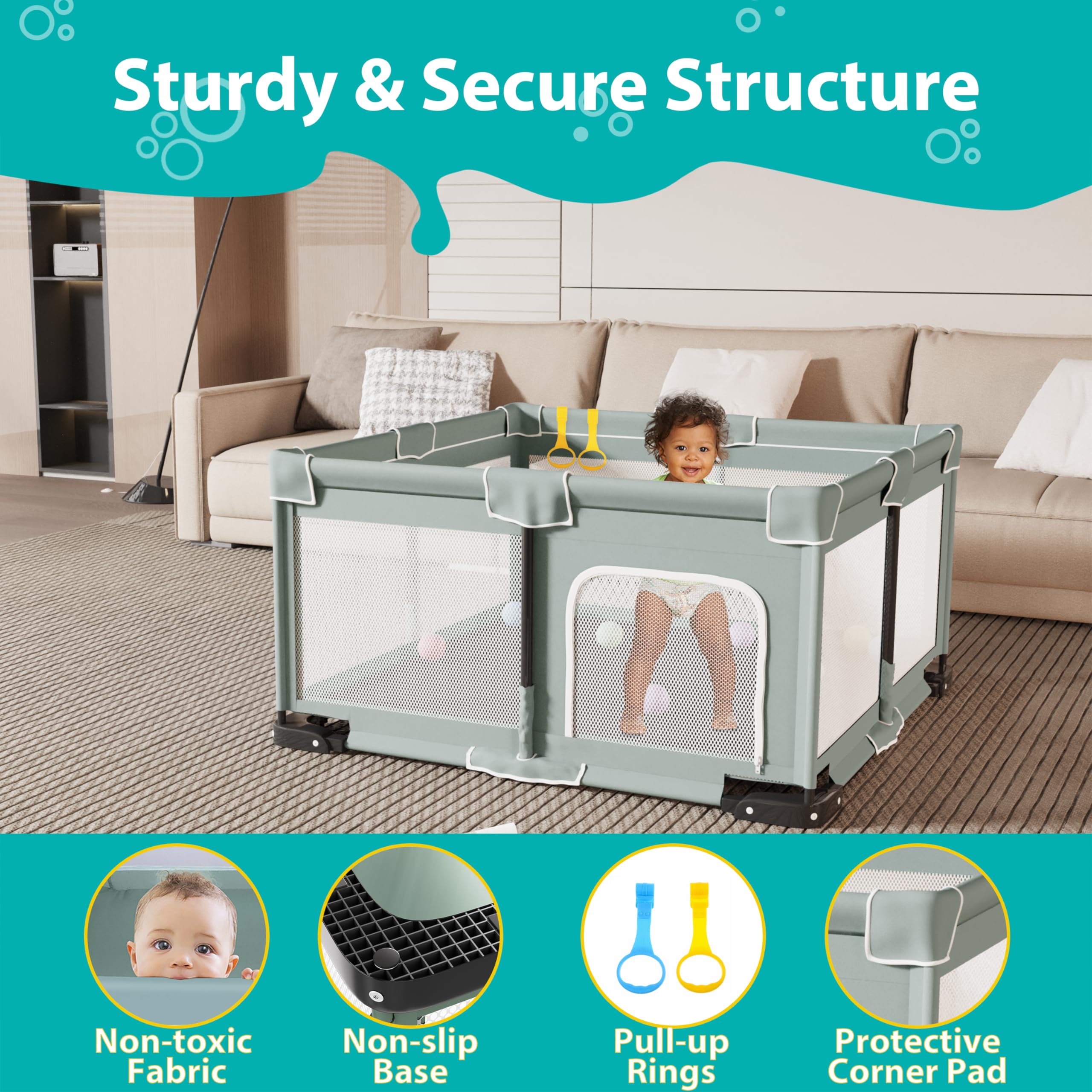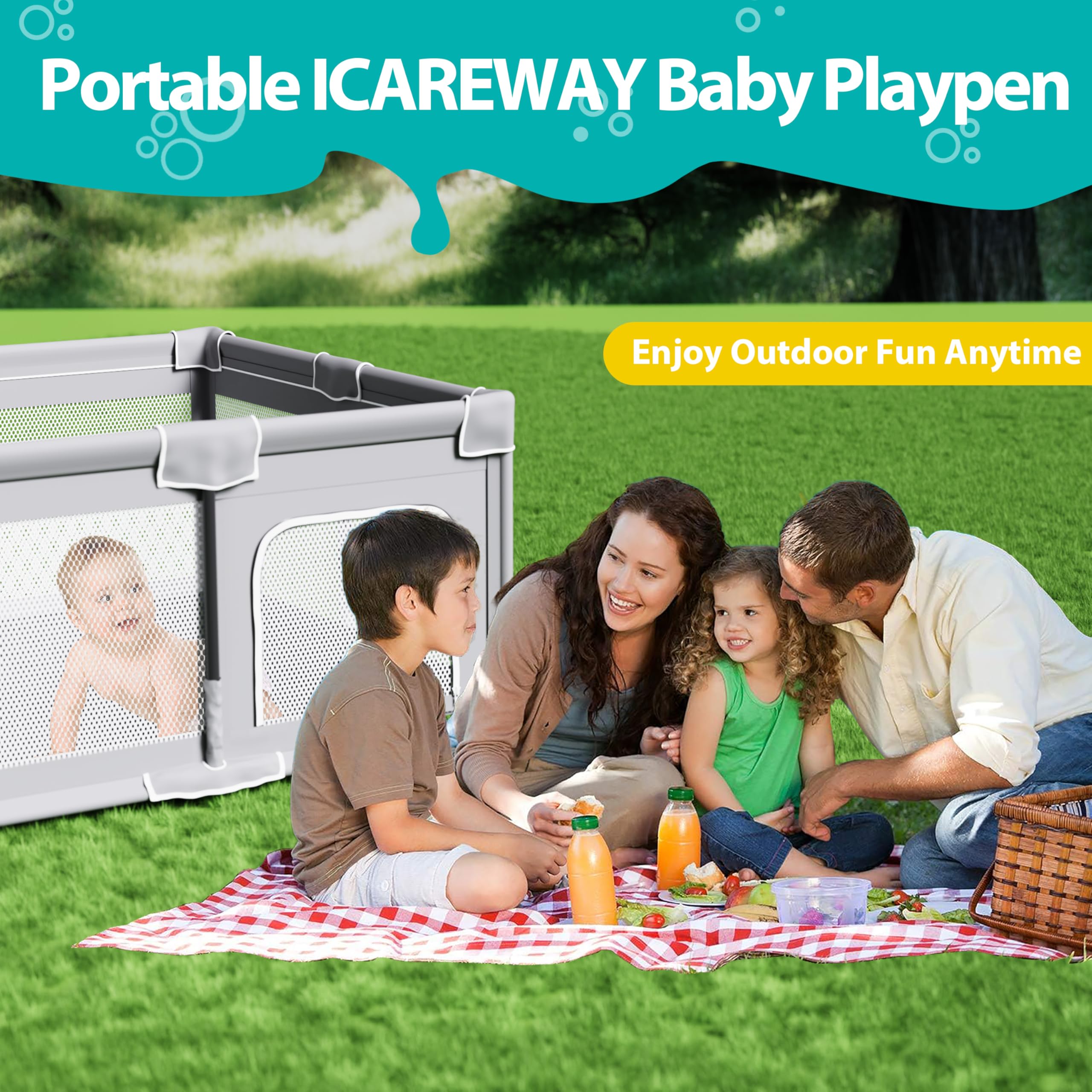 Baby's Safe Play Area:At ICAREWAY, safety is our top priority. Thatβs why our foldable play pen is constructed with high-quality materials, including robust steel pipes and sturdy fabric net siding, to provide maximum stability and ensure your baby's safety during playtime