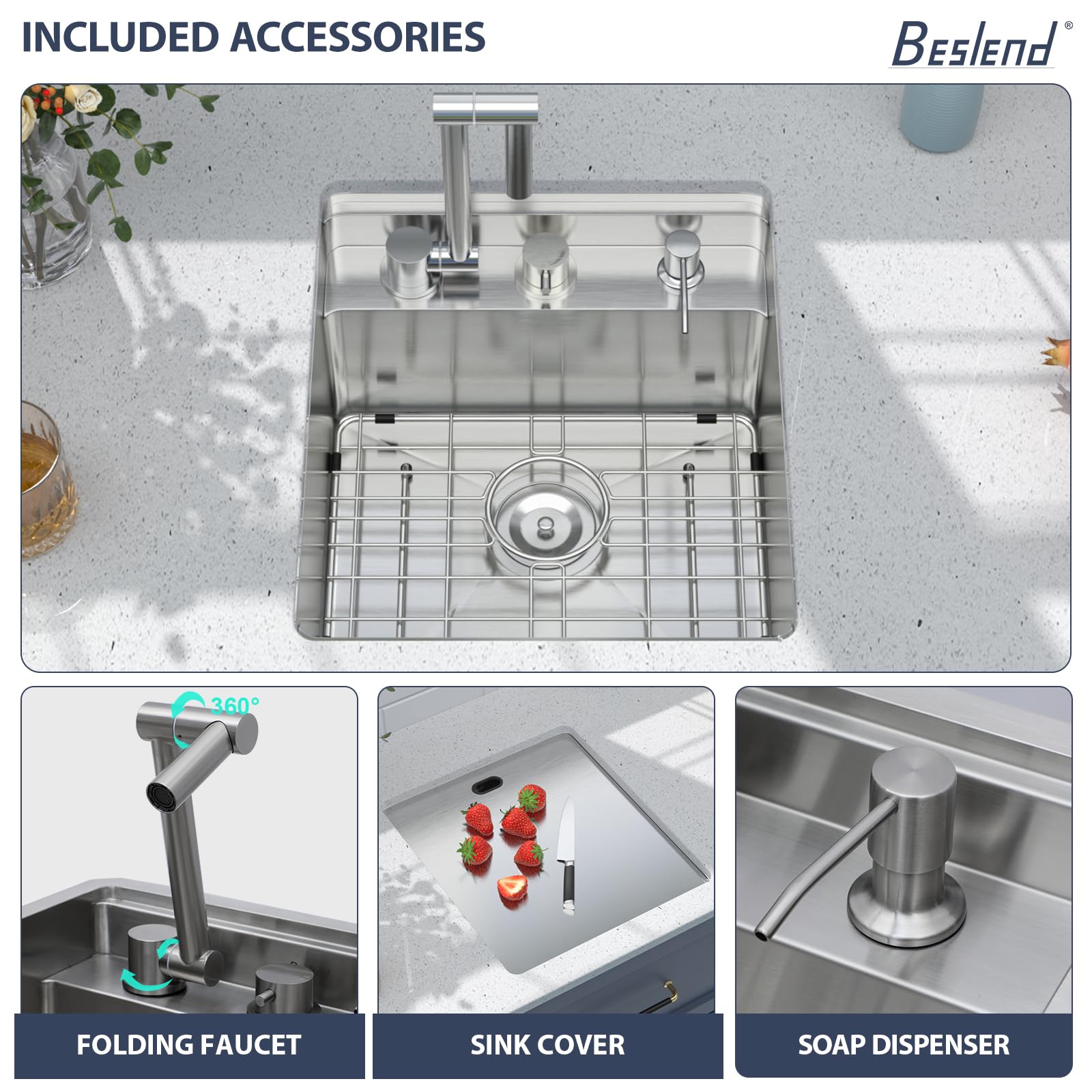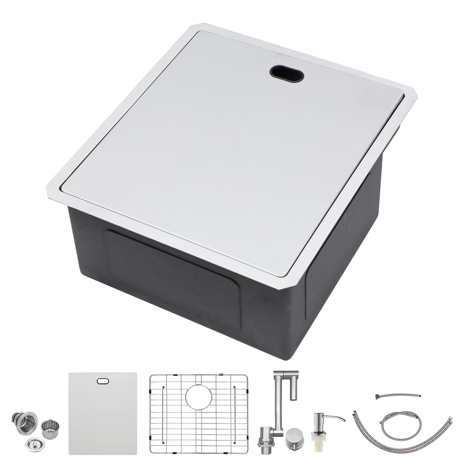 【Package Includes】17 inch stainless steel single bowl undermount bar sink, stainless steel cover, bottom grid, drain assembly, soap dispenser, folding faucet and its accessories, mounting hardware and installation guide. Complete set of kitchen bar sink for modern, convenient kitchen life.