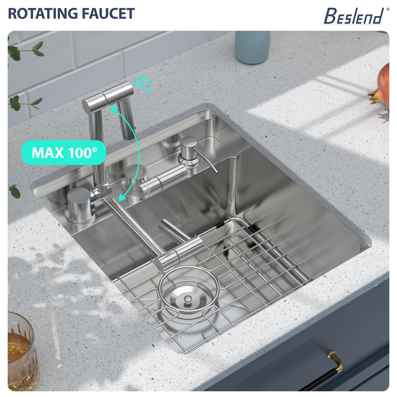 【3 Holes Bar Sink】Unique design, this undermount sink is pre-drilled with 3 faucet holes for installing the included faucet, faucet switch, and soap dispenser; this sink faucet extends and folds up to 100°, and the nozzle can be rotated 360°; when not in use, it can be folded up and covered with a stainless steel sink cover along the step recess, allowing the sink to be perfectly hidden under the countertop. This will blend in with the cabinets and the whole style of the kitchen, space-saving and beautiful.