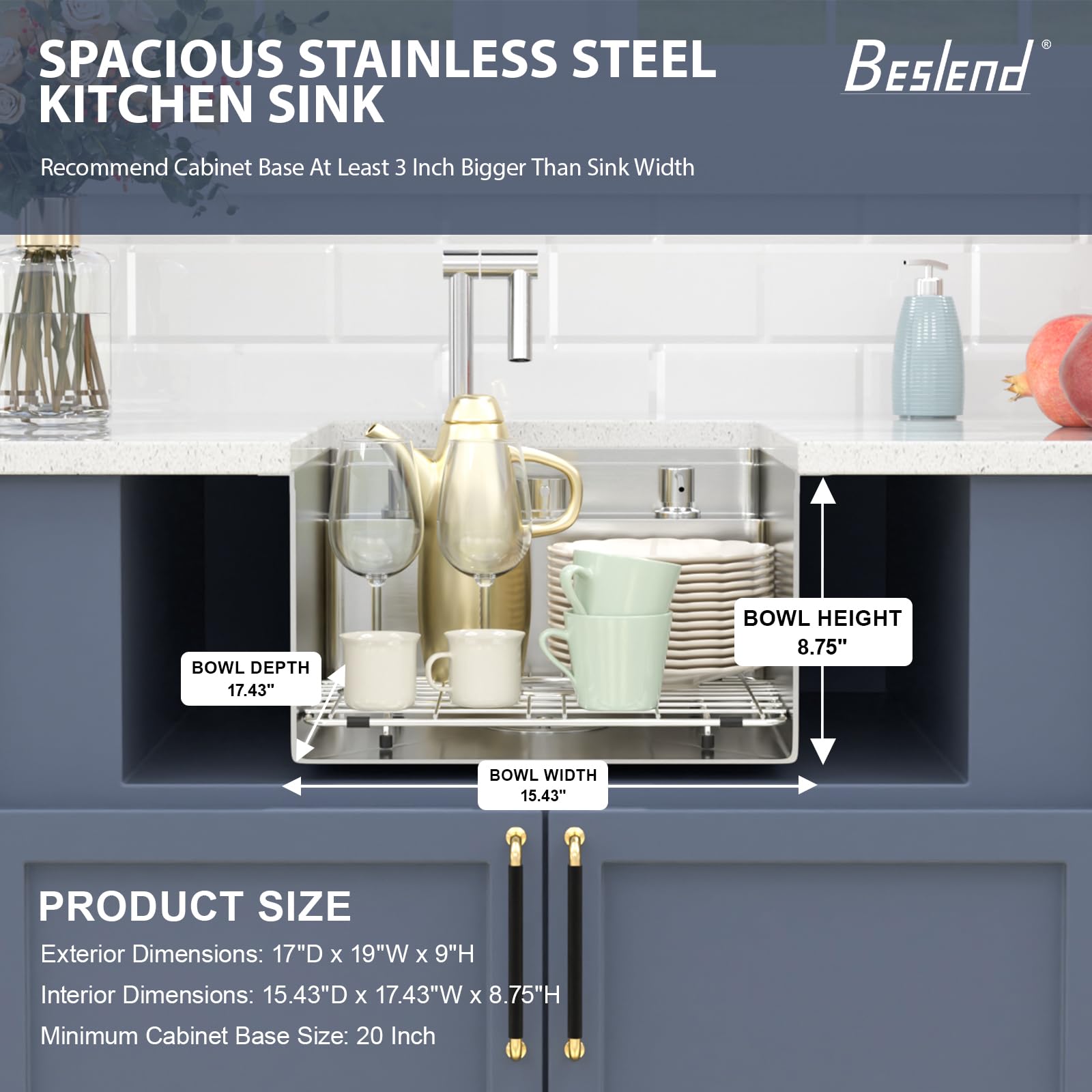 【17 Inch Single Bowl Bar Sink】External Dimensions - 17"W x 19"D x 9"H (for better installation, the minimum size of the base cabinet is 20"W). Internal Bowl Dimensions - 15.43"W x 17.43"D x 8.75"H. The moderate capacity of this 17-inch single bowl kitchen bar sink is more than enough for everyday bar use. Standard 3-1/2" offset drain opening will fit most garbage disposal unit.