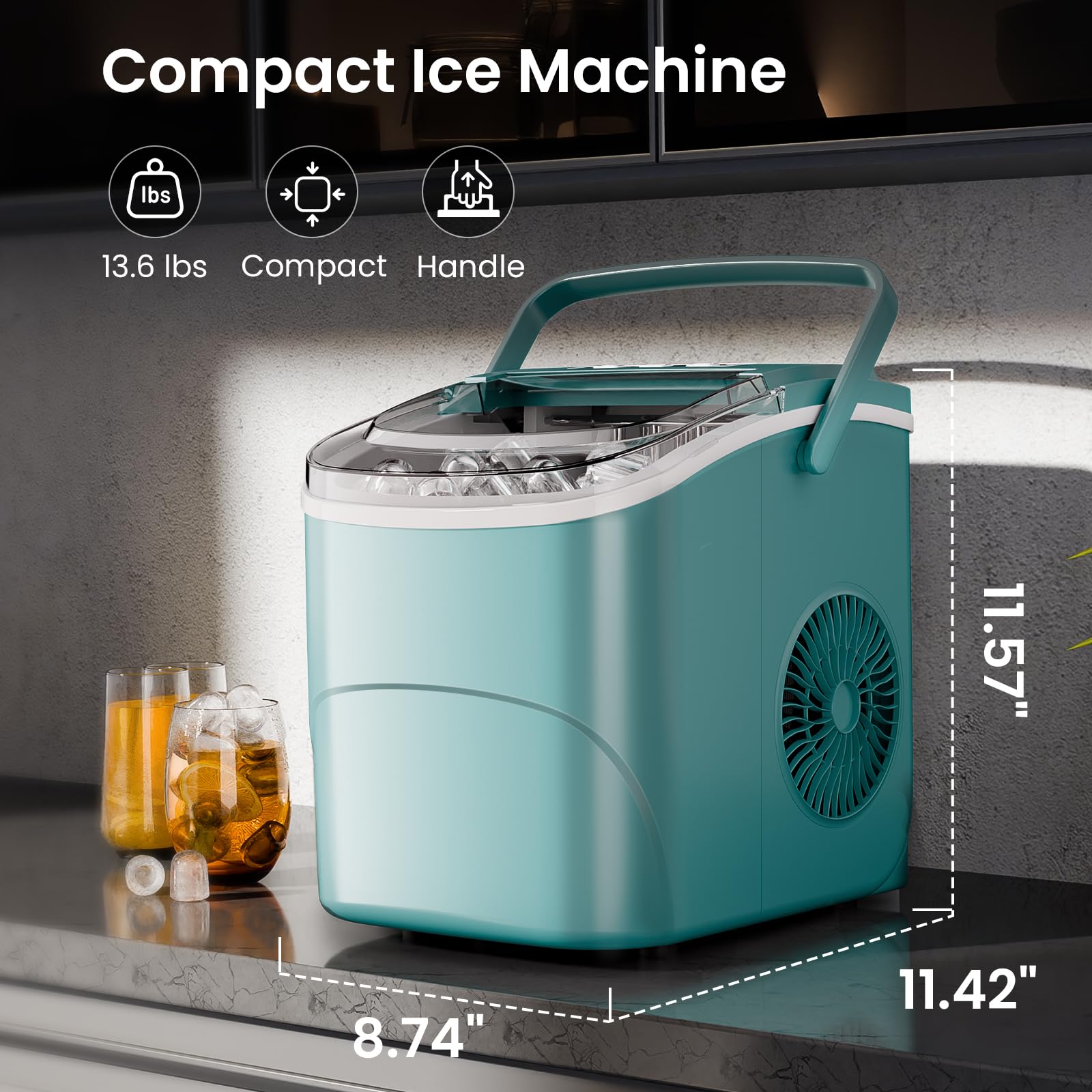 【Portable and Friendly Design】Designed for on-the-go lifestyles, small ice maker has been upgraded and improved with a sturdy handle and compact dimensions of 11.42*8.74*11.57 inches, weighing 14.25 pounds, it is extremely convenient both on the go and in storage. The large viewing window adds a user-friendly experience to observe the ice-making process in real-time.