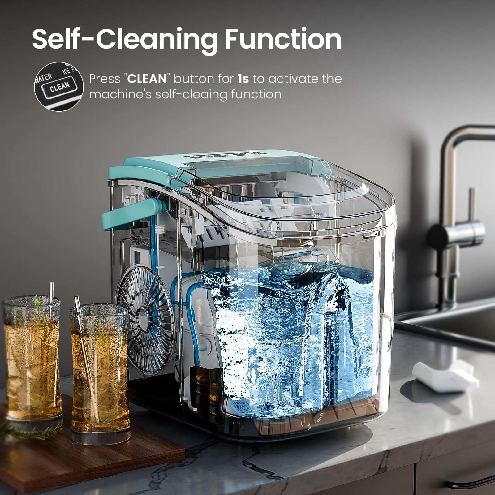 【Self-Cleaning Functionality】Say goodbye to the hassle of manual cleaning. Countertop ice maker features a one-touch self-cleaning function – simply press the "Clean" button, the machine initiates its self-cleaning process, maintaining hygiene effortlessly.leaving you with more time to enjoy the cool refreshment of your favorite beverages.