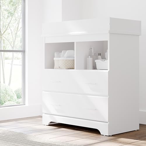 Premium "designer" accents, baby-changing functionality, and ample nursery storage are combined into one stunning package with our all-new Storkcraft Brookside 2 Drawer Changing Chest. This stylish & sturdy chest features a changing table topper that is designed to fit all standard-sized changing pads. In addition to the changing table topper, the Storkcraft Brookside 2 Drawer Changing Chest features 2 spacious drawers (complete with Euroglide drawer tracks and durable steel hardware) and 2 open storage shelves. The Brookside's sleek metal drawer handles add a premium, designer look and feel to your nursery. Crafted from durable engineered wood, and available in 2 baby-safe, non-toxic finishes, the Storkcraft Brookside 2 Drawer Changing Chest complies with all applicable federal safety standards. Also, the changing topper is JPMA Certified. To complete your nursery, pair the Storkcraft Brookside 2 Drawer Changing Chest with the rest of the Brookside Collection: the Storkcraft Brookside 3 Drawer Chest, Storkcraft 3 Drawer Combo Dresser, Storkcraft Brookside 4 Drawer Chest, or Storkcraft Brookside 6 Drawer Double Dresser. Exclusively from Storkcraft, the longest standing name in baby furniture and proud recipient of the 2022 Women's Choice Award for 9 out of 10 Customer Recommended Baby & Kids Furniture. Easy assembly required. Backed by Storkcraft's 1-year limited warranty and expert customer care.