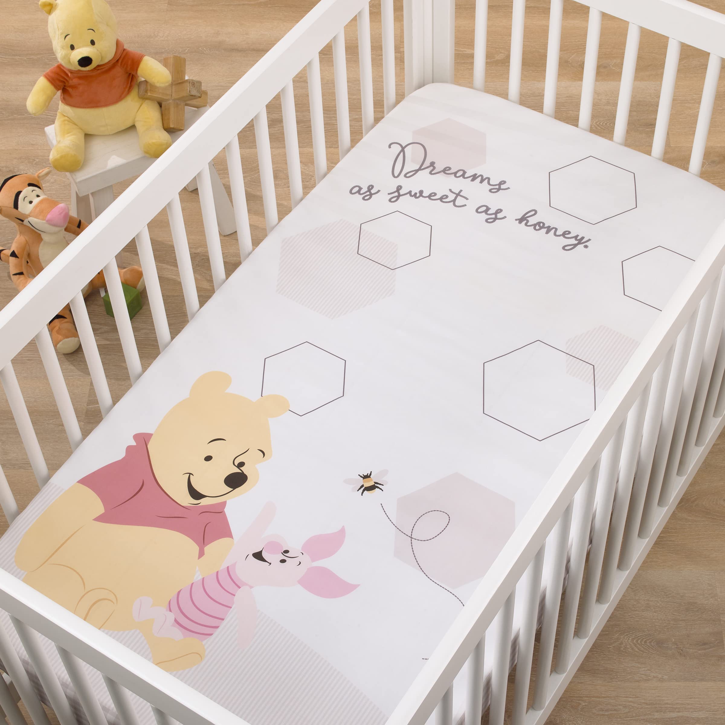 Winnie the Pooh Hugs & Honeycombs Photo Op Fitted Crib Sheet is designed to create the perfect photo opportunity by capturing baby's milestones and special moments. Features Winnie the Pooh and Piglet playing with a honey bee and words that say "Dreams as sweet as honey"! Made of 100% cotton fabrics for a peaceful night's sleep. Designed in a soft grey and white check border and honeycomb pattern. Measures 28" x 52" x 8" and fits a standard size crib/toddler mattress. Machine washable for easy care! Coordinates with the complete line of Disney Winnie the Pooh Hugs & Honeycombs bedding and accessories!