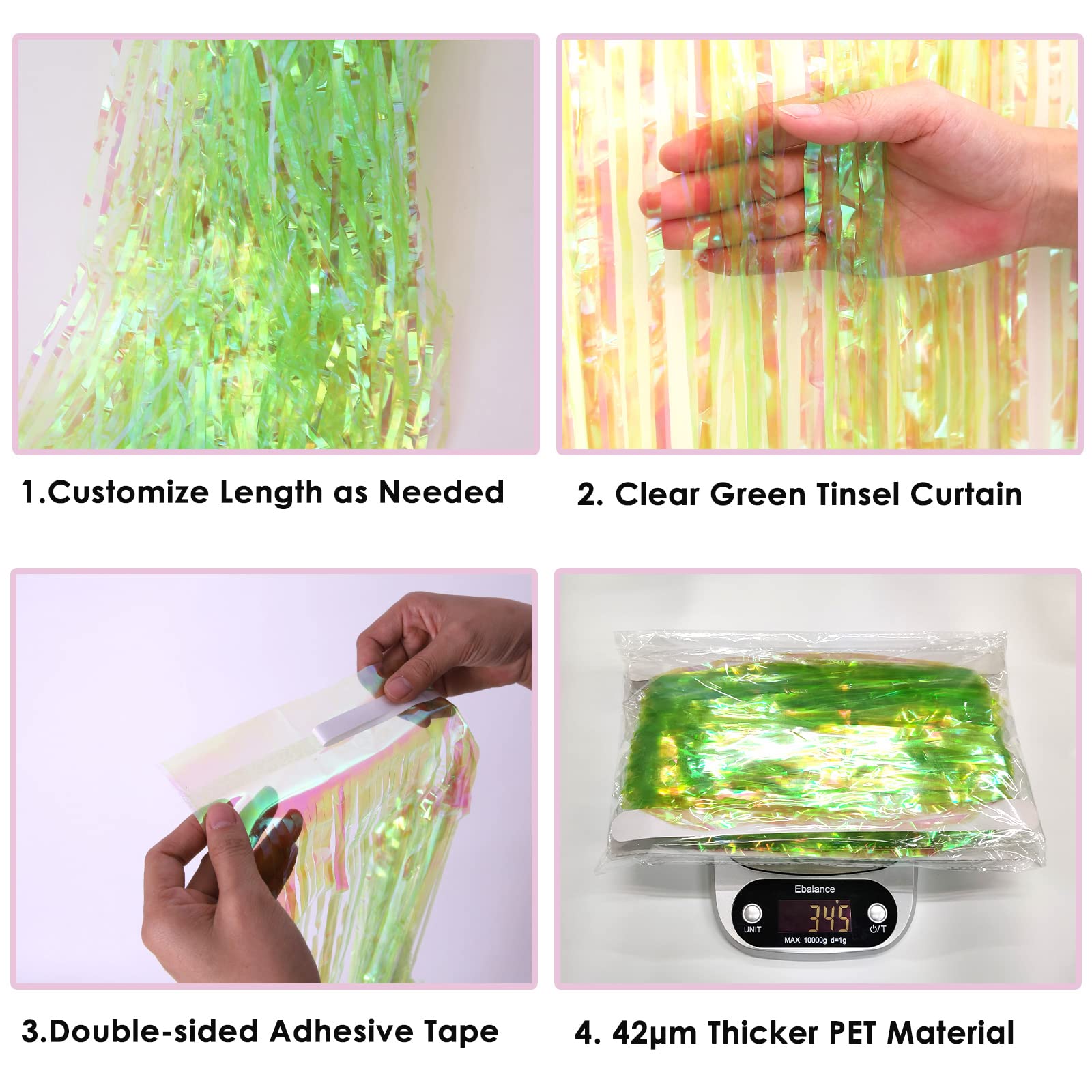 【Package Contains】The pack contains 2 pieces of iridescent green tinsel backdrop, both are 3.2ft wide and 8.2ft long. Ideal hanging decorations for window, wall curtaion, ceiling or coverage a wall fully. With this big green foil fringe curtain, you can make a perfect green tinsel backdrop for your jungle party decorations.