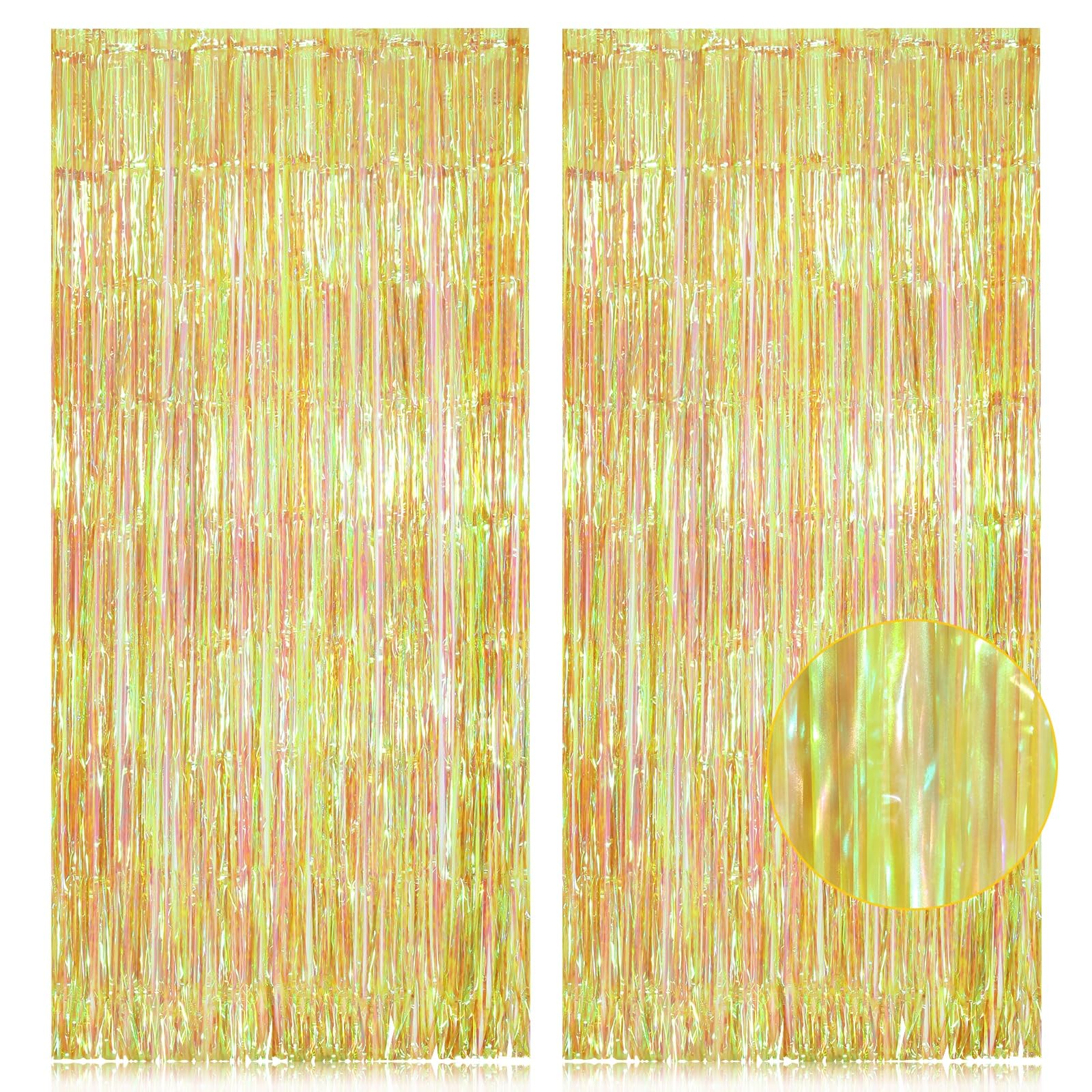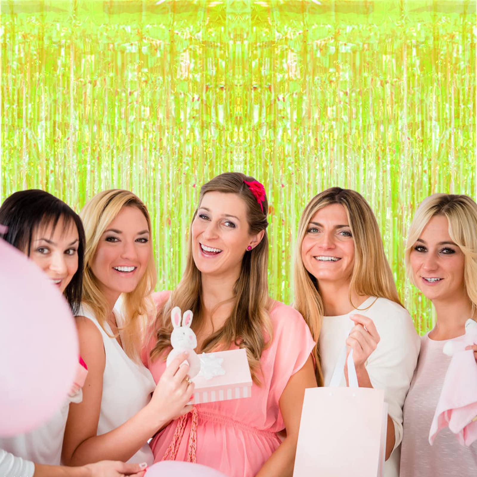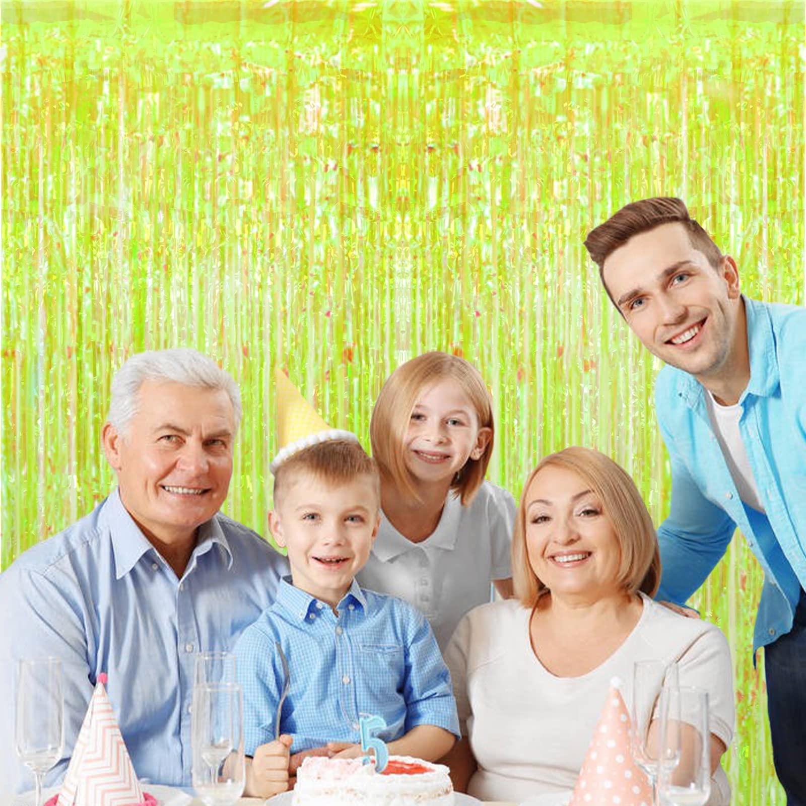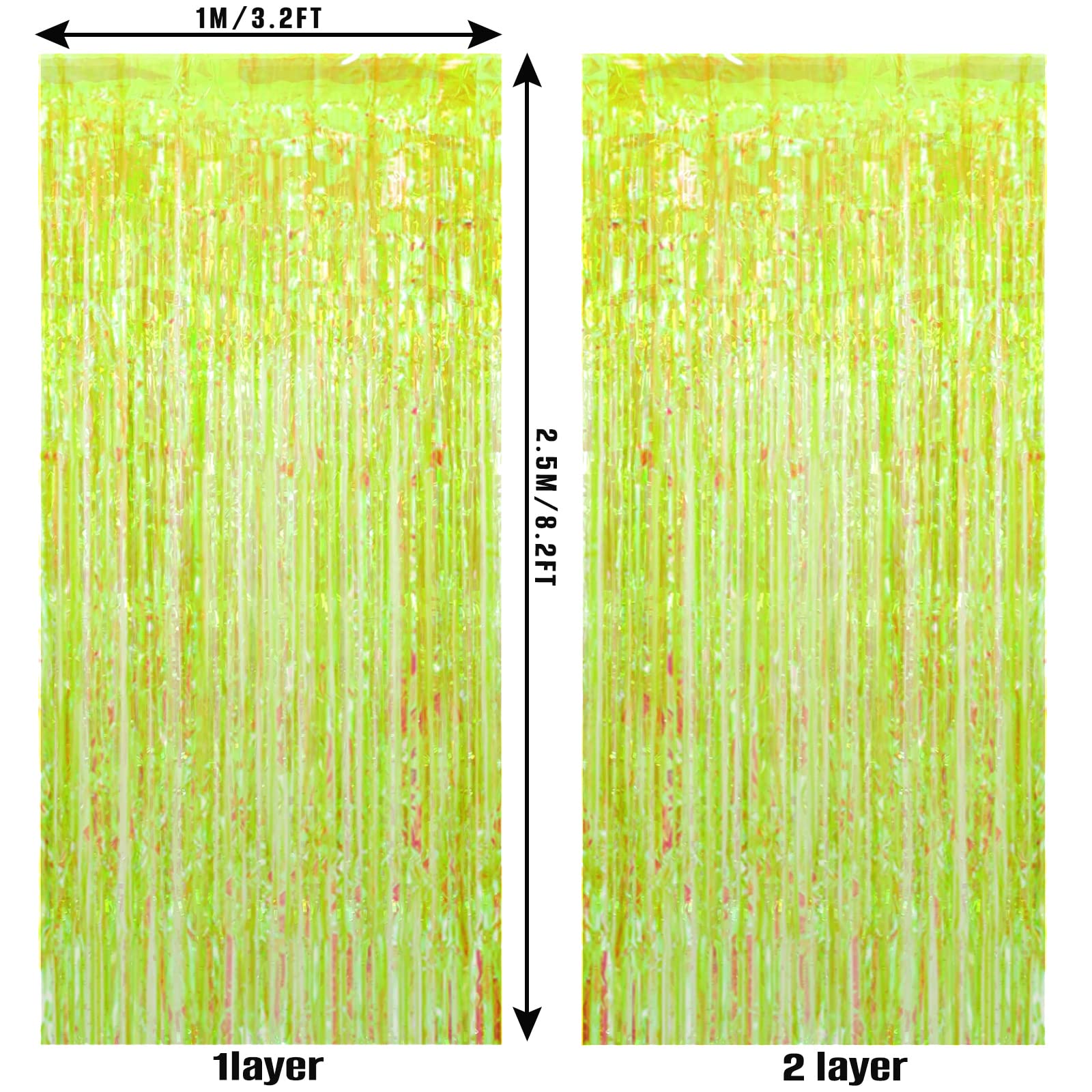 【Easy to Apply】This green tinsel foil fringes curtain comes with double sided tape on the back of them, easy to use, pasting on the top of wall, door or window, you can also hang it up with a rope. You can cut the tinsel by scissors to suitable size according to needs. 2 packs of the curtains side by side to make the backdrop larger, or layer the 2 pack curtains to achieve a thicker and denser effect.