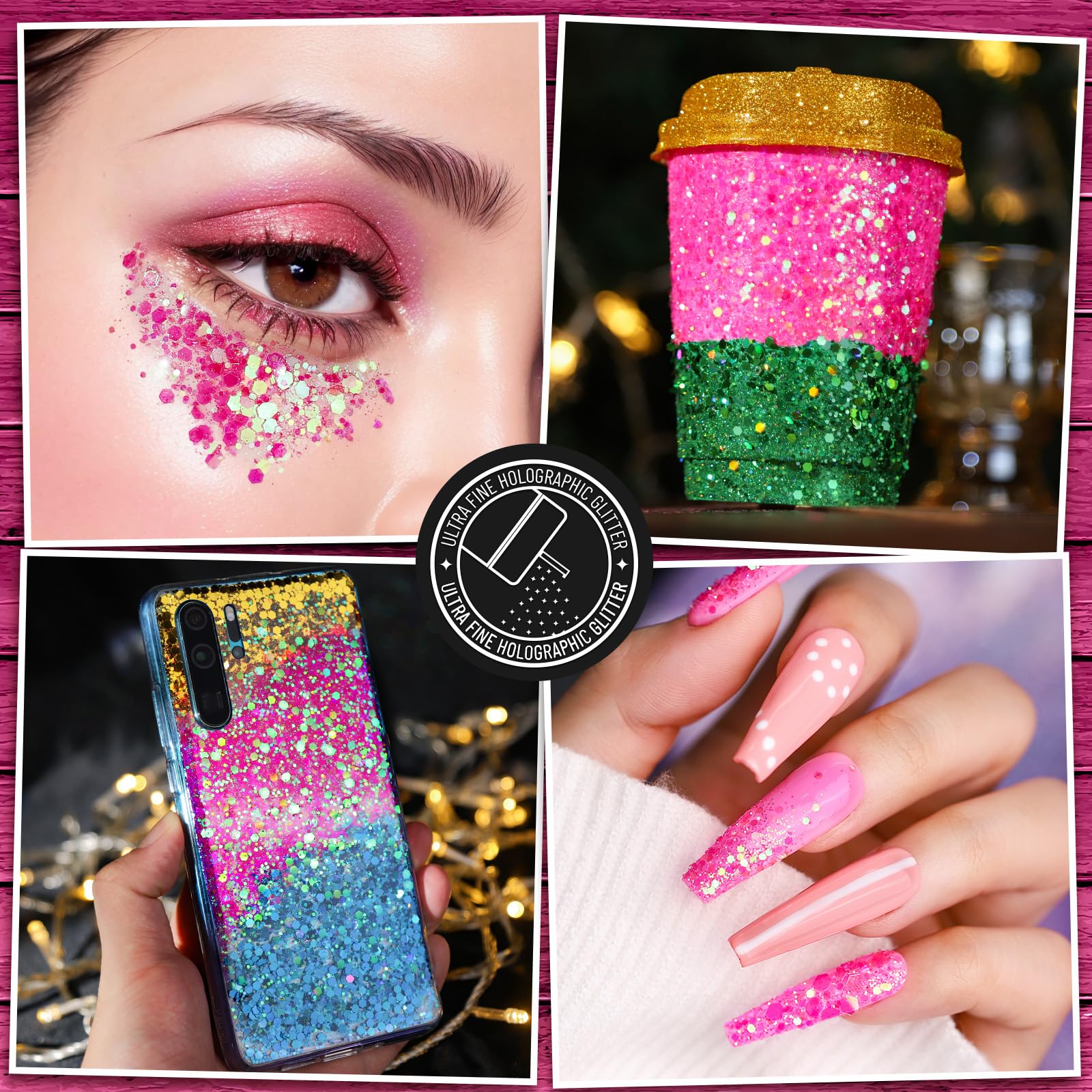 Versatile Glitter for Crafts & Beauty: Perfect craft glitter for creative DIY projects, like resin art crafts, tumbler making, candle making, card making, painting, DIY glitter heels, glitter phone case, glitter flower vase etc. Also ideal body glitter, face glitter, hair glitter, makeup glitter, nail glitter, to make gorgeous look!