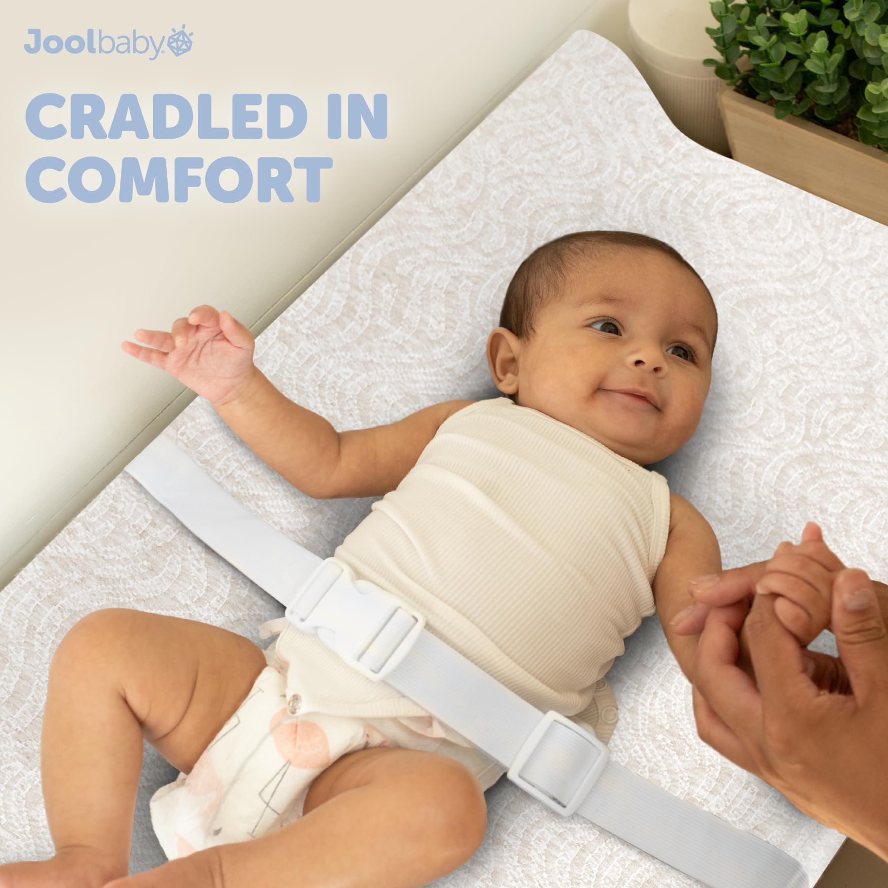 CONTOURED SIDES & SAFETY STRAP help keep your wiggly infant in place, making changing diapers easier on you (and your back).
